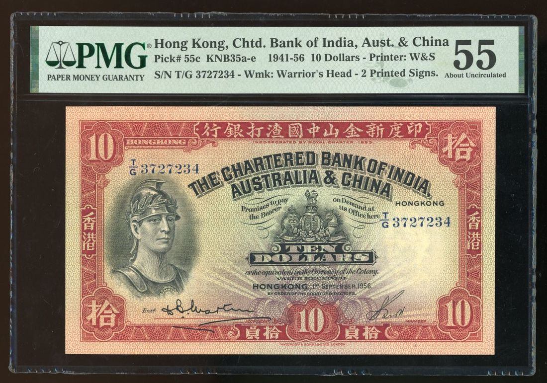 Chartered Bank of India, Australia & China, Hong Kong, $10, 1.9.1956, serial number T/G 3727234, (Pick 55c), PMG 55