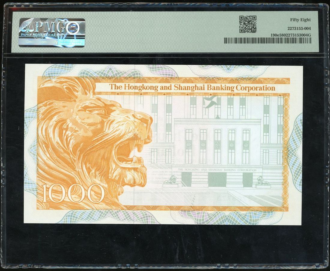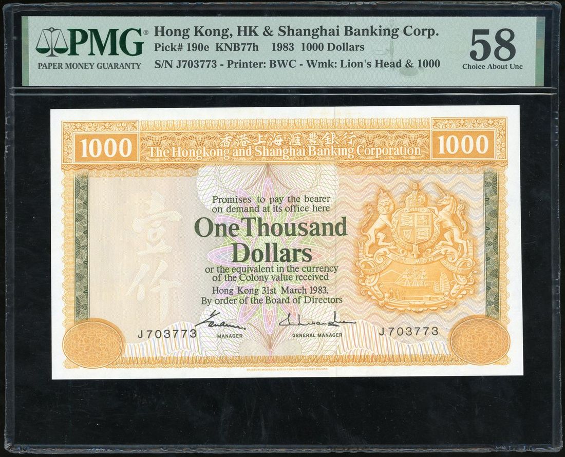 Hongkong and Shanghai Banking Corporation, $1000, 31.3.1983, serial number J703773, (Pick 190e), PMG 58 Choice About Uncirculated.