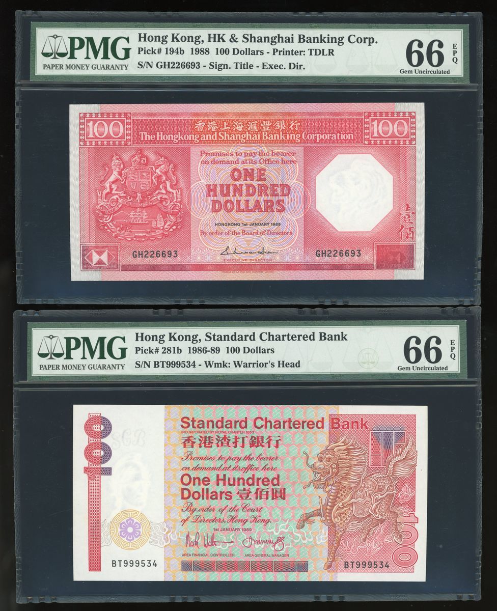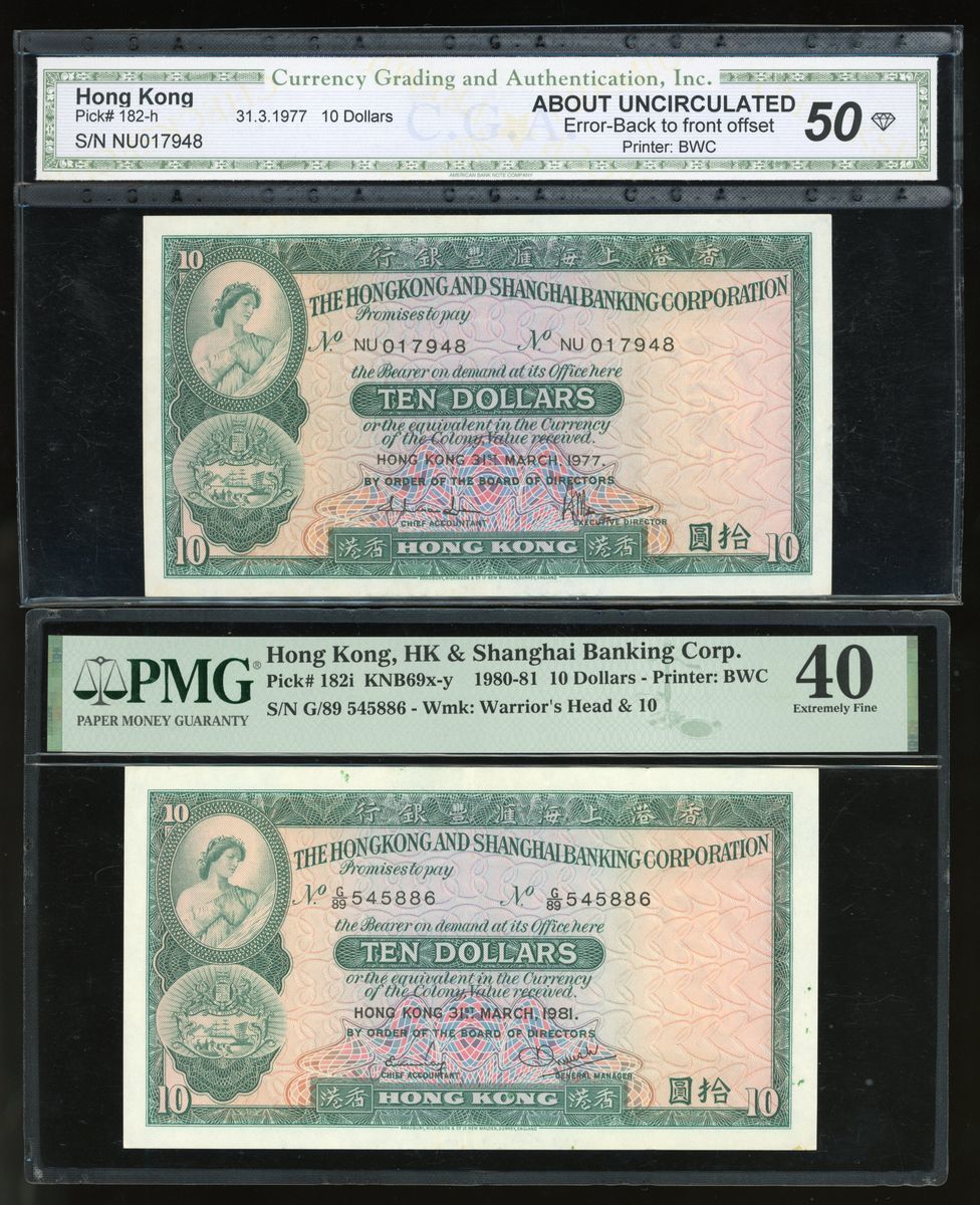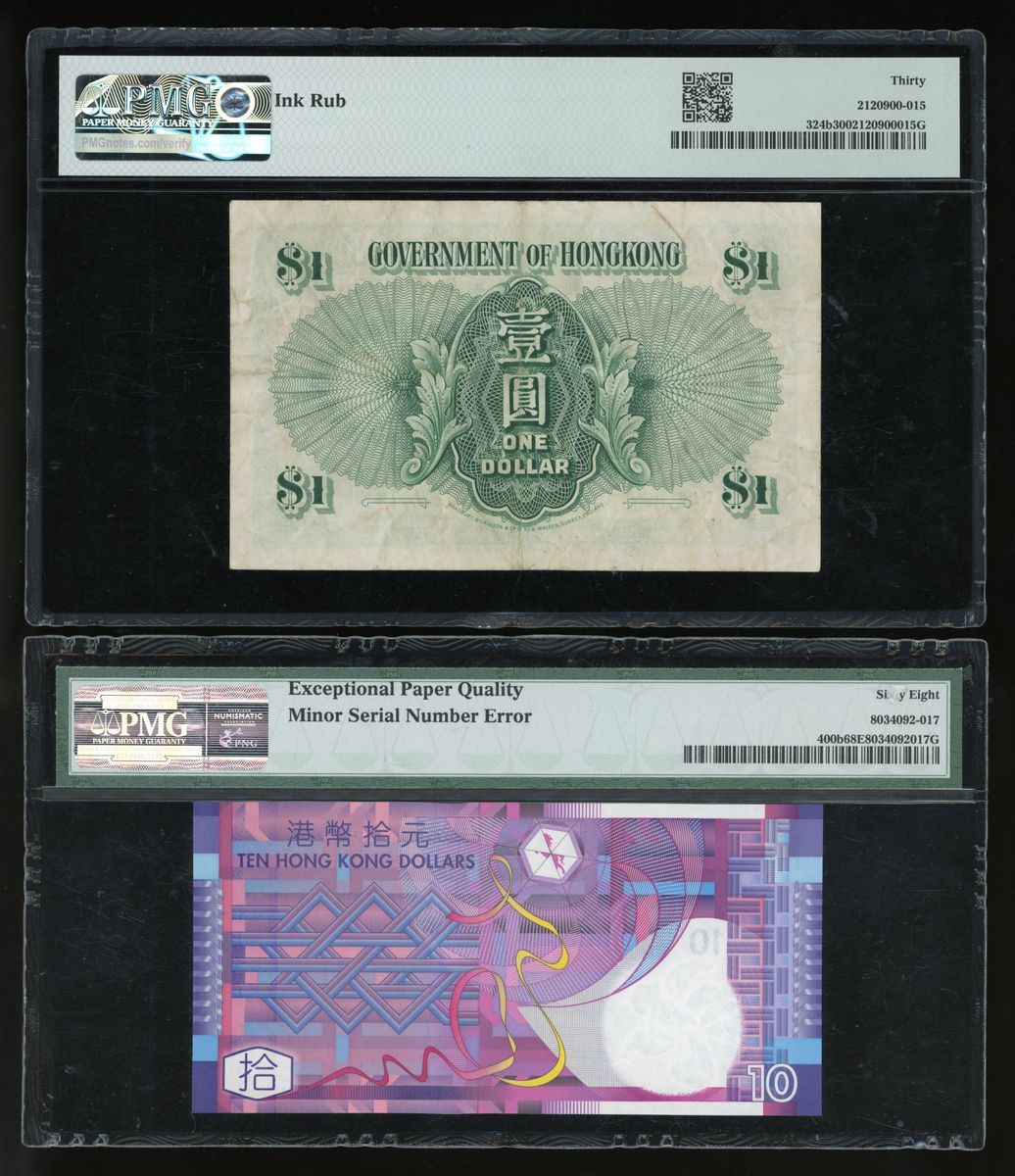 香港紙鈔一組8枚,包括:1977年匯豐銀行拾圓錯體票、1981年匯豐銀行拾圓、1988年匯豐銀行壹佰圓、1989年渣打銀行壹佰圓、1940-1941年香港政府一仙2枚連號、1952年壹圓及2003年香港政府拾元。拾圓錯體票CGA評50,其他PMG分別評40、66EPQ、66EPQ65EPQ、64、30 (有墨漬)及68EPQ