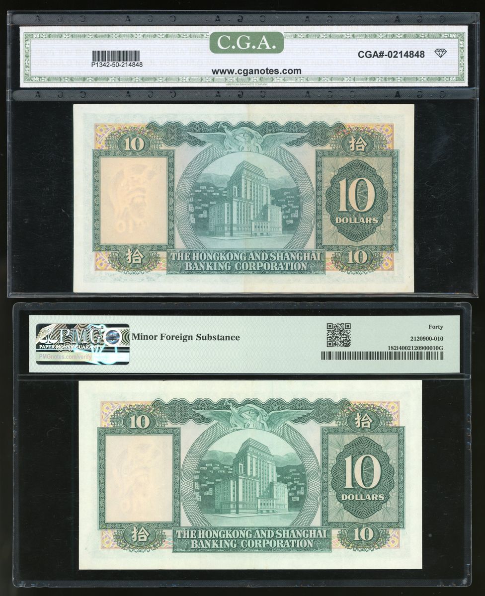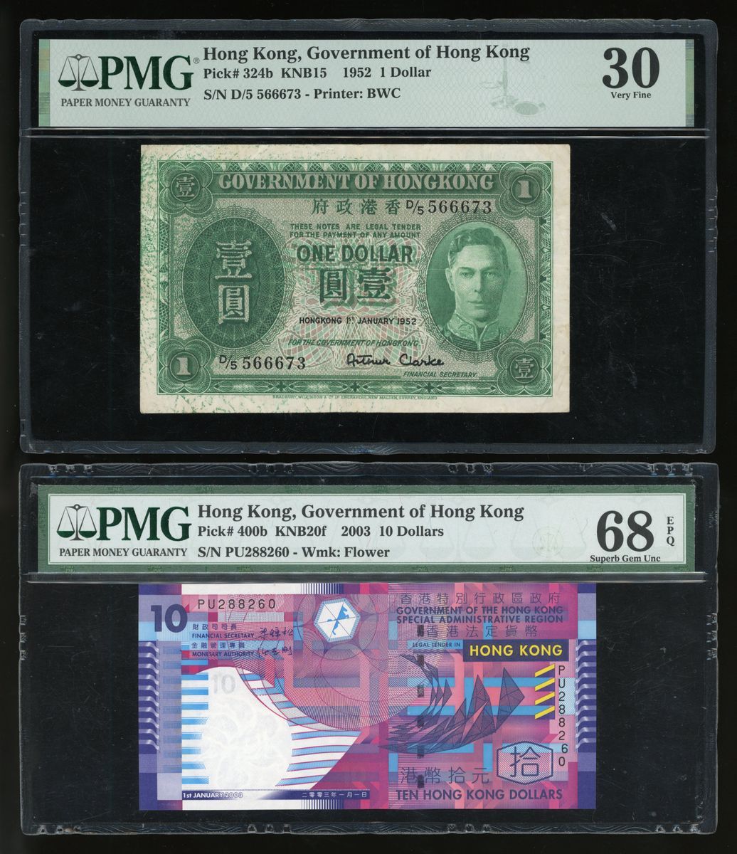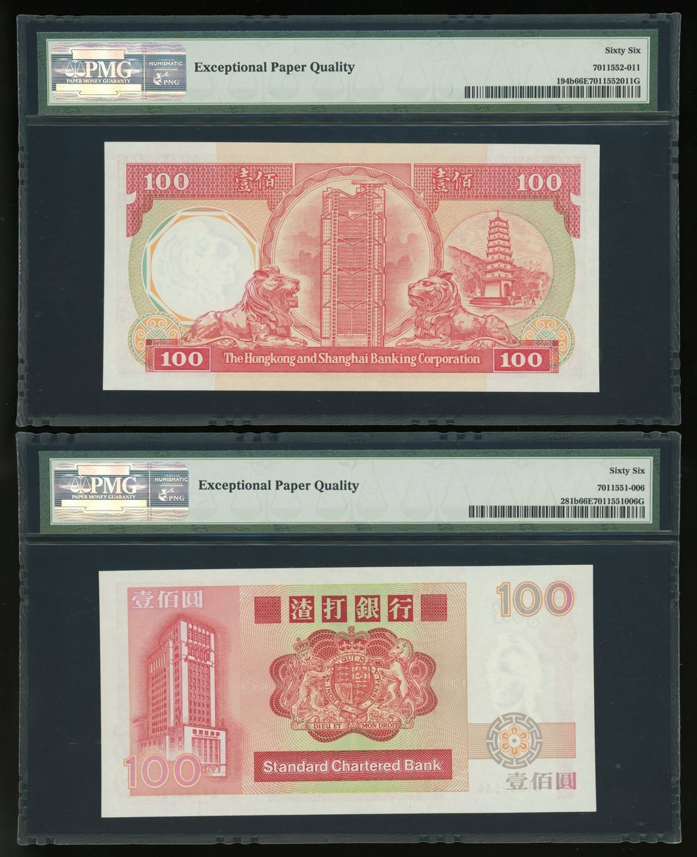 香港紙鈔一組8枚,包括:1977年匯豐銀行拾圓錯體票、1981年匯豐銀行拾圓、1988年匯豐銀行壹佰圓、1989年渣打銀行壹佰圓、1940-1941年香港政府一仙2枚連號、1952年壹圓及2003年香港政府拾元。拾圓錯體票CGA評50,其他PMG分別評40、66EPQ、66EPQ65EPQ、64、30 (有墨漬)及68EPQ
