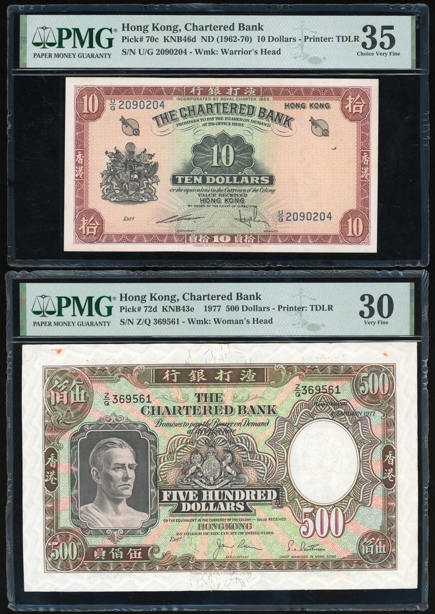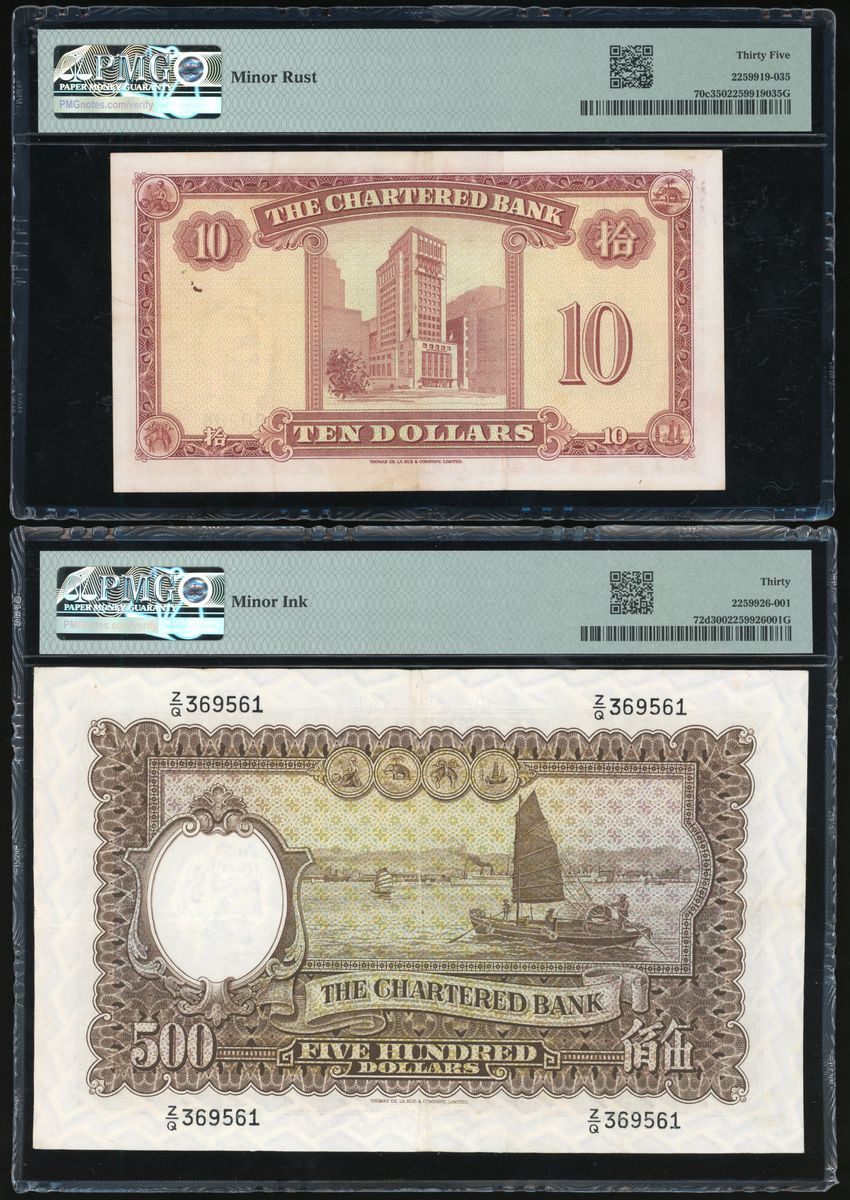 香港紙鈔一組8枚,包括:1977年渣打銀行伍佰圓、1975年渣打銀行伍圓、1962-70年渣打銀行拾圓及1968年匯豐銀行伍佰圓,PMG分別評30 (有墨漬)、40 (有銹漬)、35 (有些微銹漬)及20