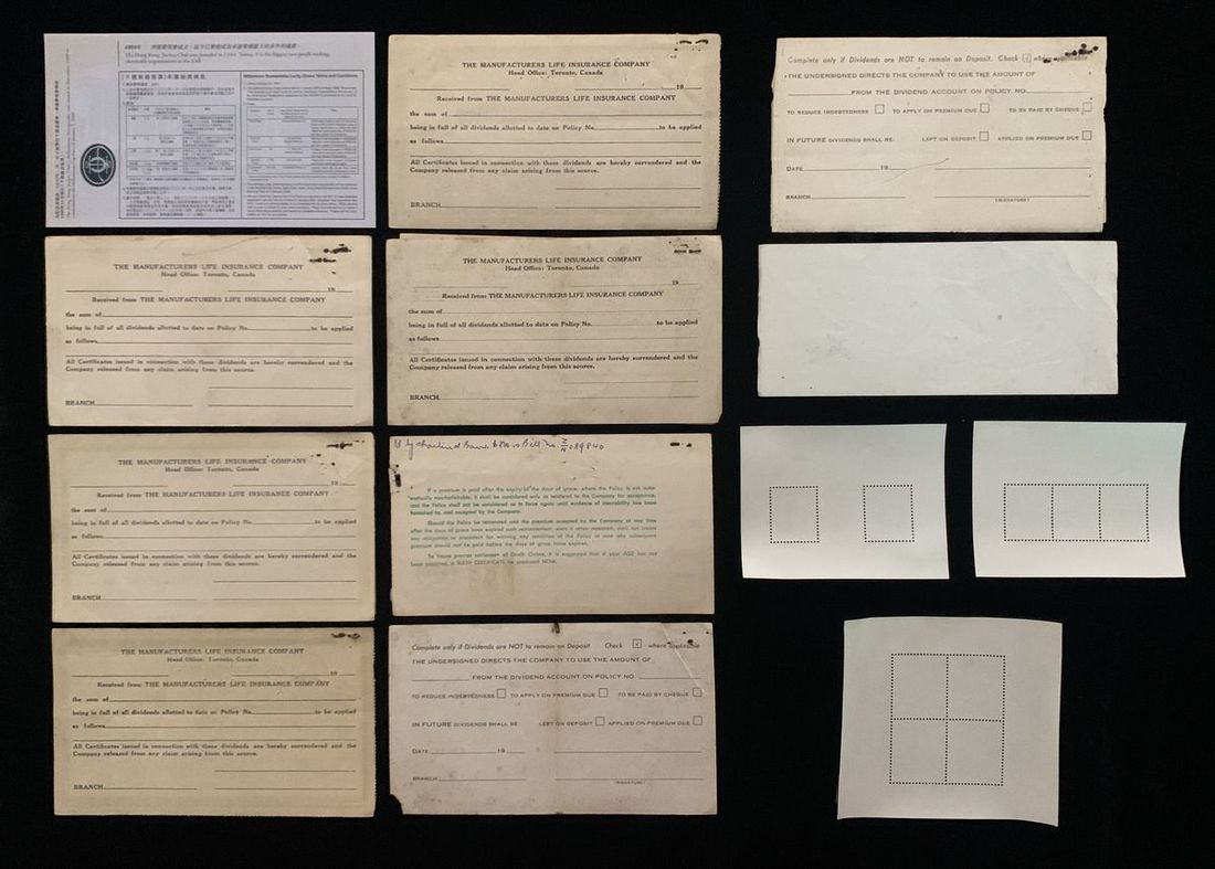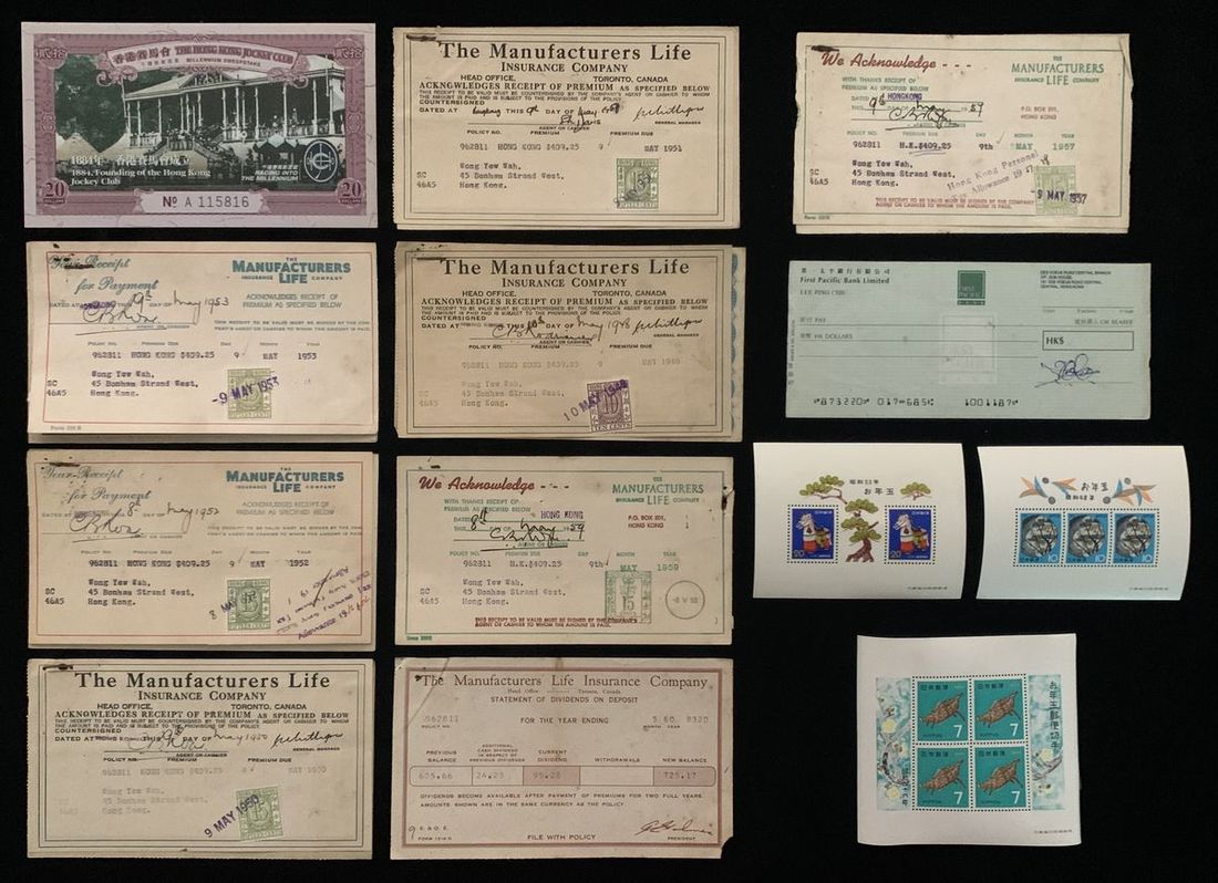 Finacial paper euphemia, includes a polymer Hong Kong Jockey Club, millennium sweepstake ticket, 1999, also a group of The Manufacturers Life Insurance Company (now Manulife) dividens deposit receipts, all with HK revenue stamps (8)