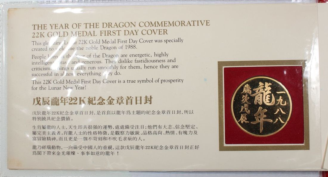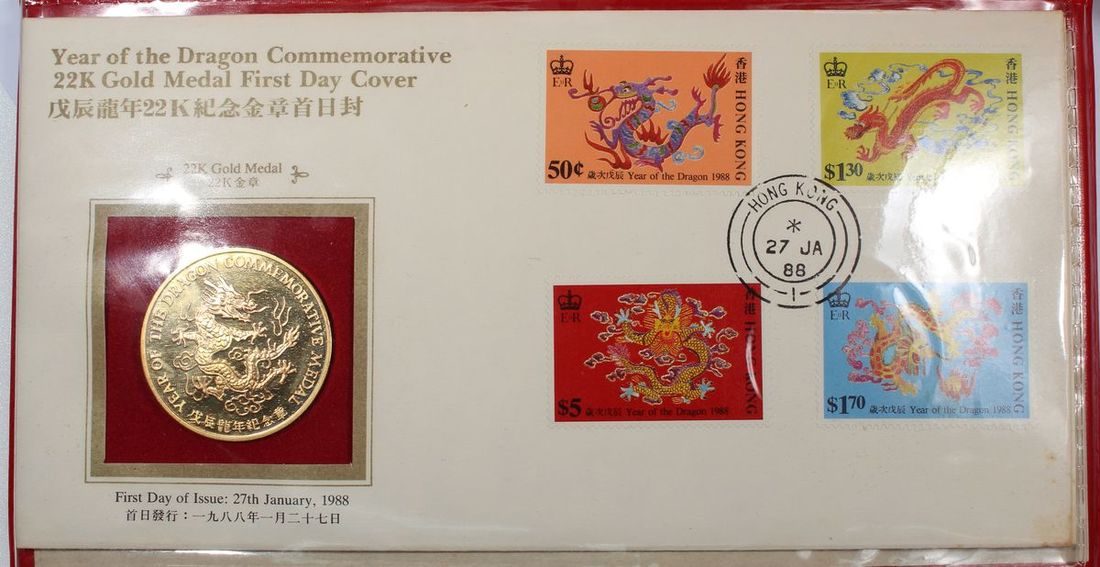 Hong Kong, Year of the Dragon Commemorative 22K Gold Medal First Day Cover, consists of 22k gold medal and 4x stamps with the First-Day-of-Issue chop by the Hong Kong Post Office, 1988, gold medal weight 25.7g, uncirculated, limited issue for 5000 sets, with original package and certificate, #1709.