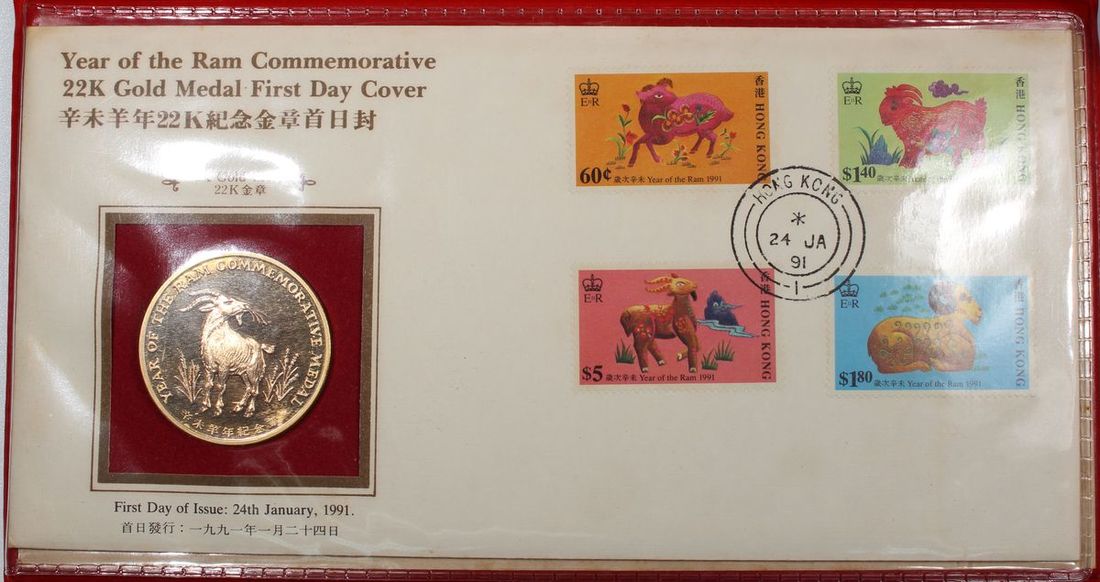 Hong Kong, Year of the Ram Commemorative 22K Gold Medal First Day Cover, consists of 22k gold medal and 4x stamps with the First-Day-of-Issue chop by the Hong Kong Post Office, 1991, gold medal weight 25.7g, uncirculated, limited issue for 5000 sets, with original package and certificate, #1983.
