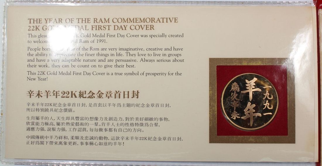 1991年香港羊年22k紀念金章首日封,金章重25.7克,UNC品相,發行量5000套,證書號碼1983,附原裝封套