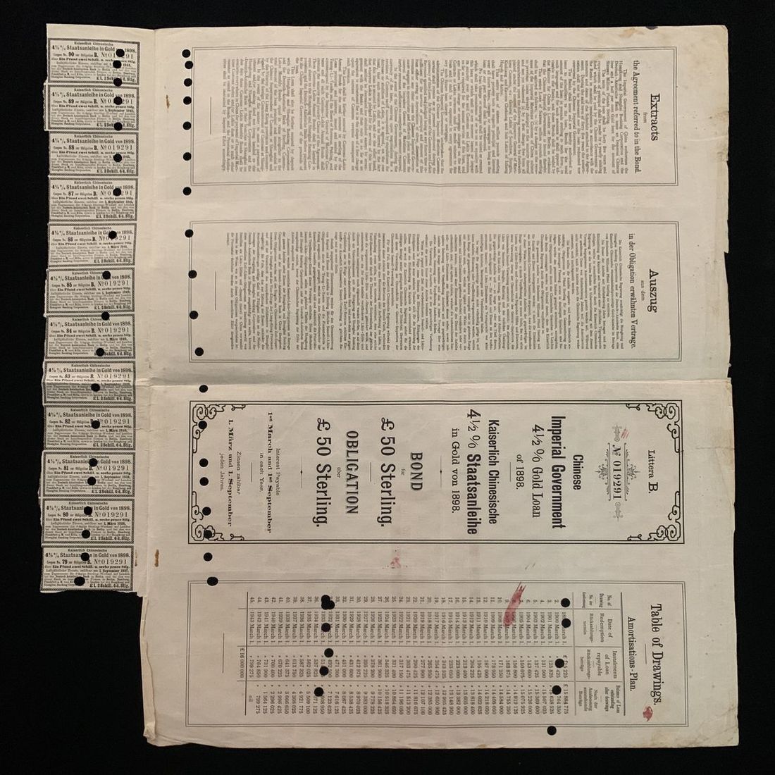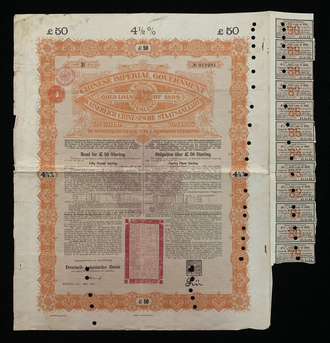Chinese Imperial Government 5% Gold Loan, £50, 1898, serial number 019291, issued by Deutsch-Asiatische Bank, various hole punches at right and on chops and signatures, with coupons, very fine