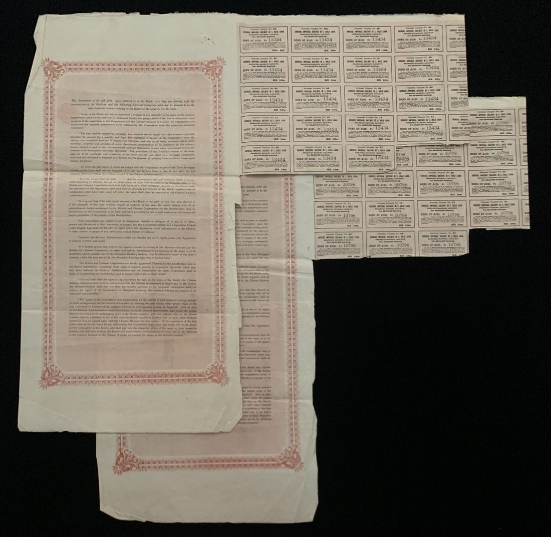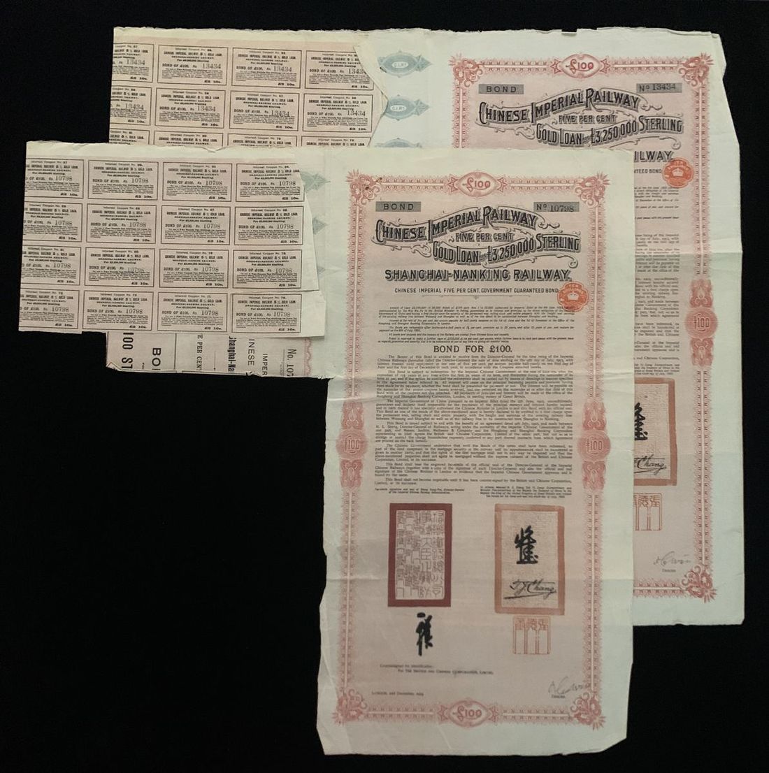Imperial Chinese Government, Shanghai-Nanking Railway 5% Gold Loan, a pair of bonds, 100 pounds, 1904, serial numbers 13434 and 10798, vertical format, floral border, black text on pink underprint, two large Chinese seal bottom left and right,