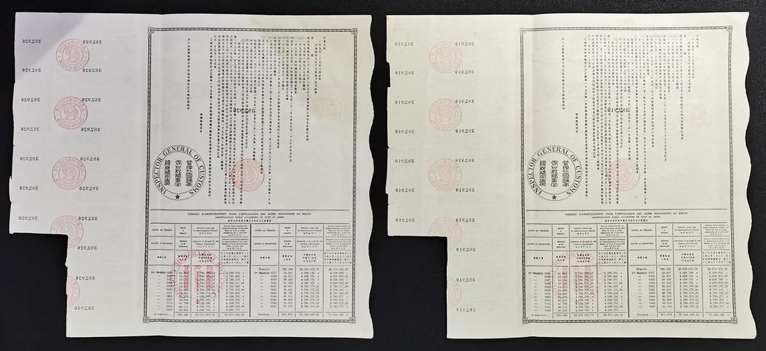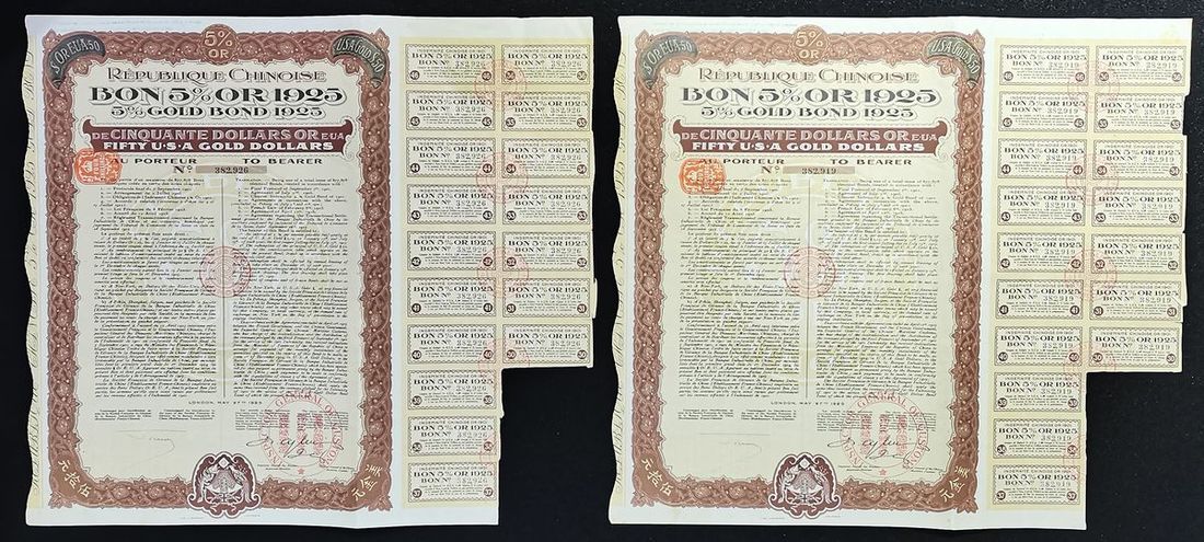 Imperial Chinese Government Railway 5% Gold Loan, a pair of bonds, consists of: 100 pound loans for the Shanghai-Nanking Railway, 1908, serial number 26379, and 20 pounds loans for Tientsin-Pukow Railway, serial number 09065,