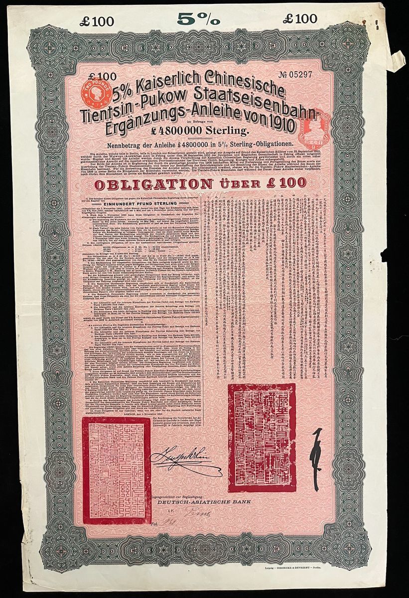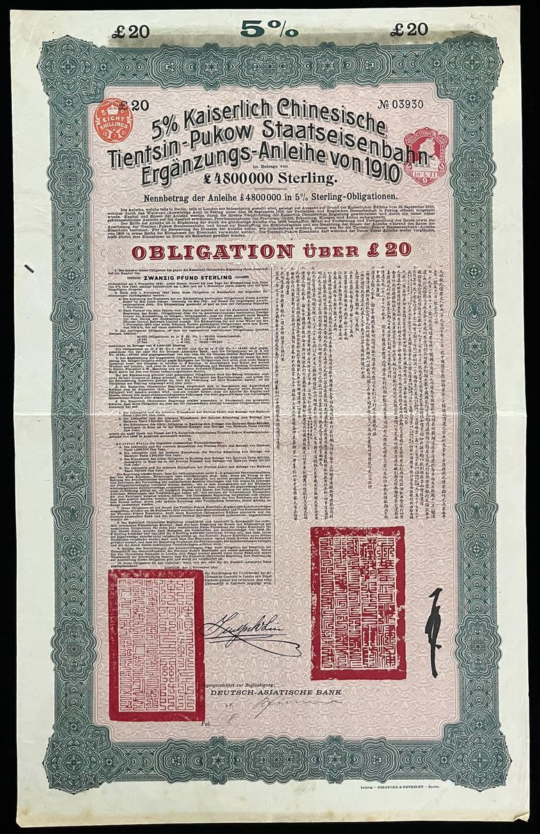 (x) Imperial Chinese Government, Tientsin-Pukow Railway Loan, a pair of £20 bond, 1908, issued by Deutsch-Asiatische, serial number 11698, 28855, both signed by Minister of Railway Development Li Haihuan and Minster to Germany Sun Baoqi,