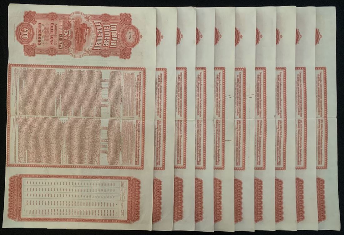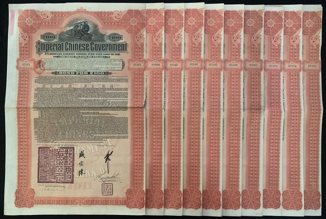 Imperial Chinese Government, 5% Hukuang Railways Sinking Fund Gold Loan, a group of 5x £20 bond, 1911, issued by the Deutsch-Asiatische Bank, serial numbers 22809-10, 30203-04 and 30889, very fine to extremely fine, mild toning (5).