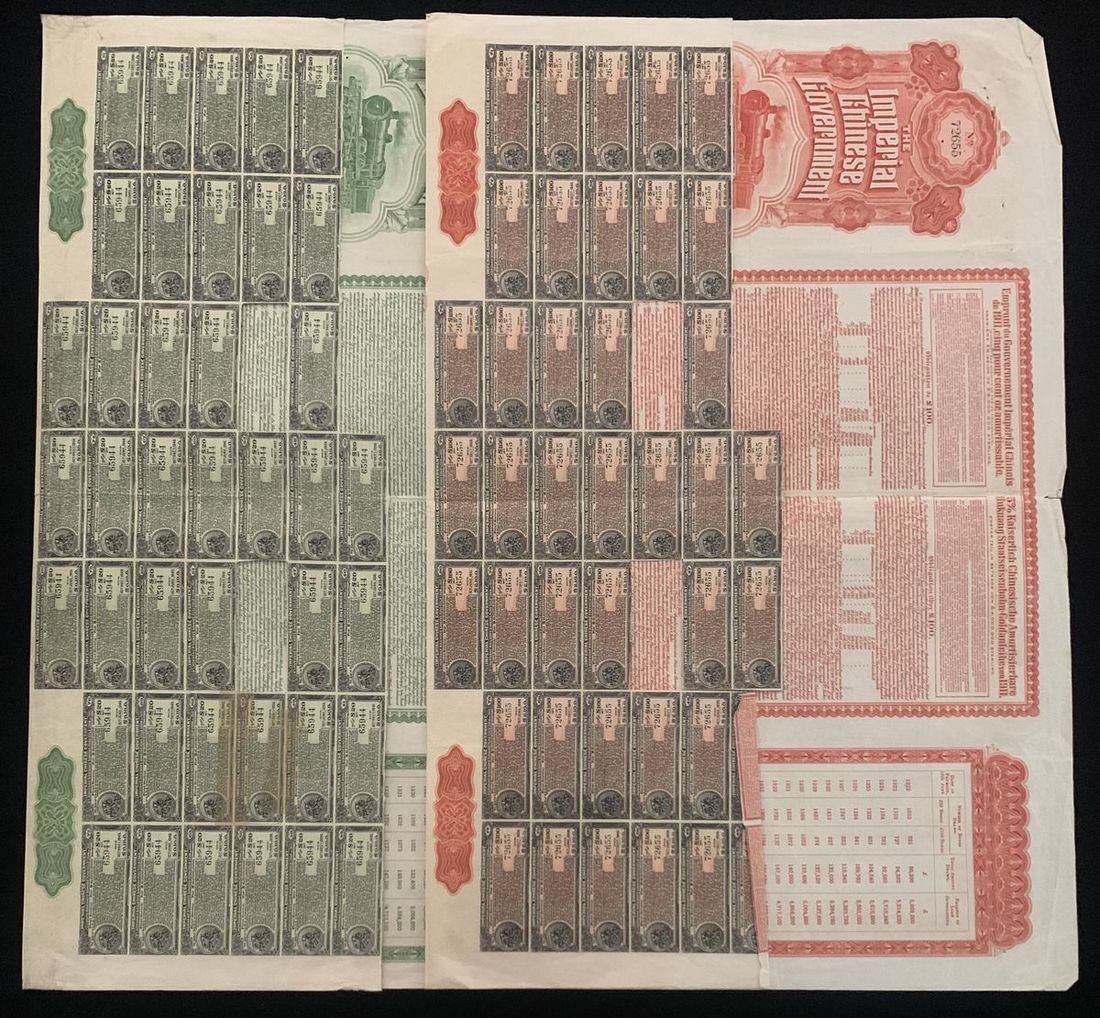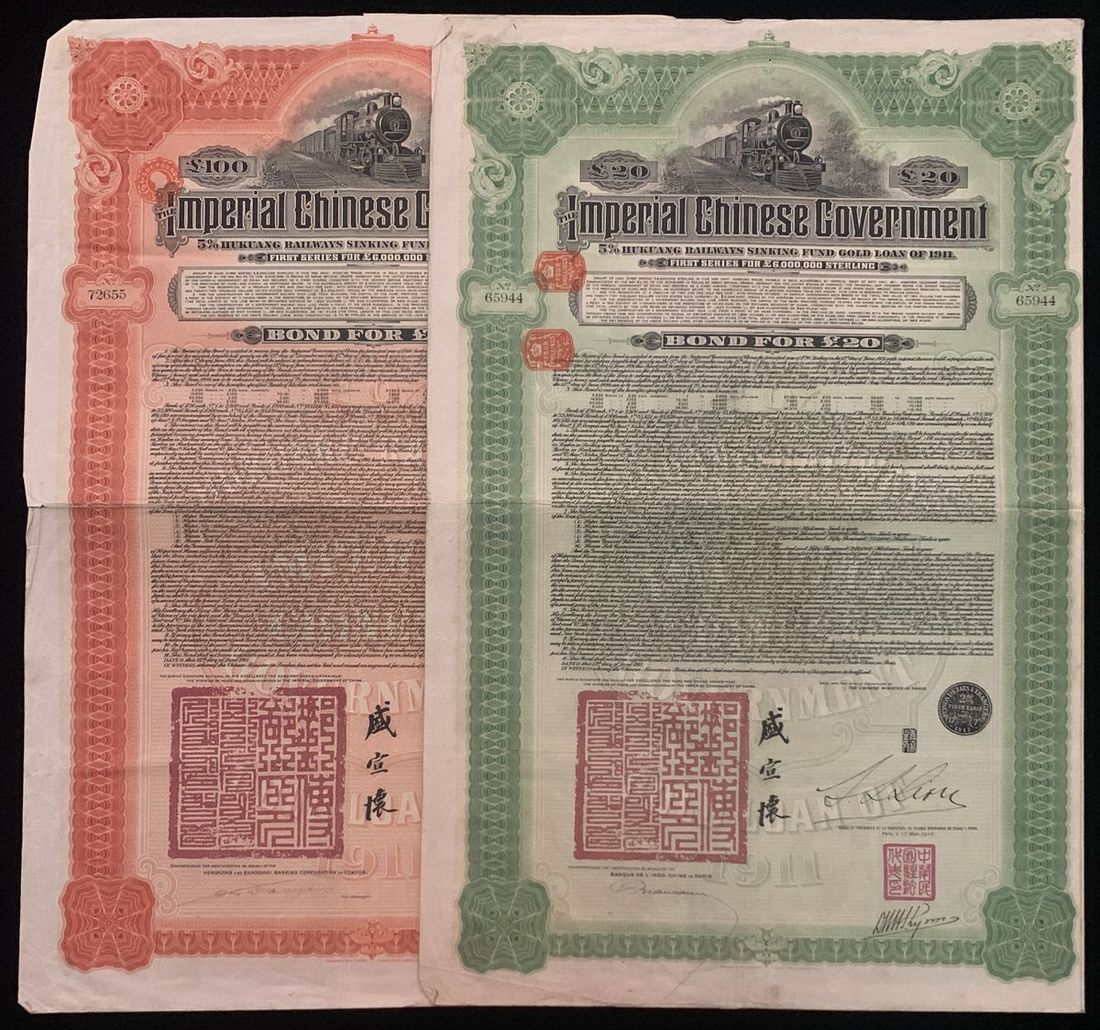 Imperial Chinese Government, 5% Hukuang Railway Sinkiang Fund Gold Loan of 1911, a lot of 10x £100 bonds, issued by Deutsch-Asiatic Bank, a few with consecutive serial numbers, black and red, steam train at top centre, all without coupons,