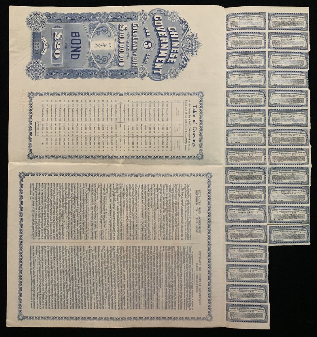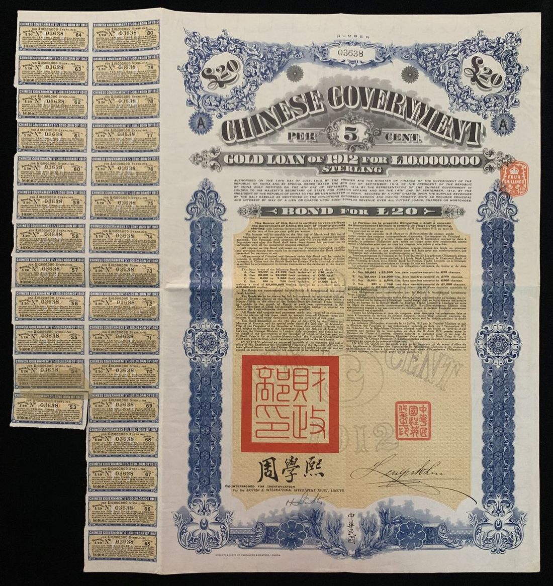Chinese Government 5% 'Crisp' Gold Loan, £20, 1912, serial number 03638, The Chinese Government Gold Loan of 1912 was originally for