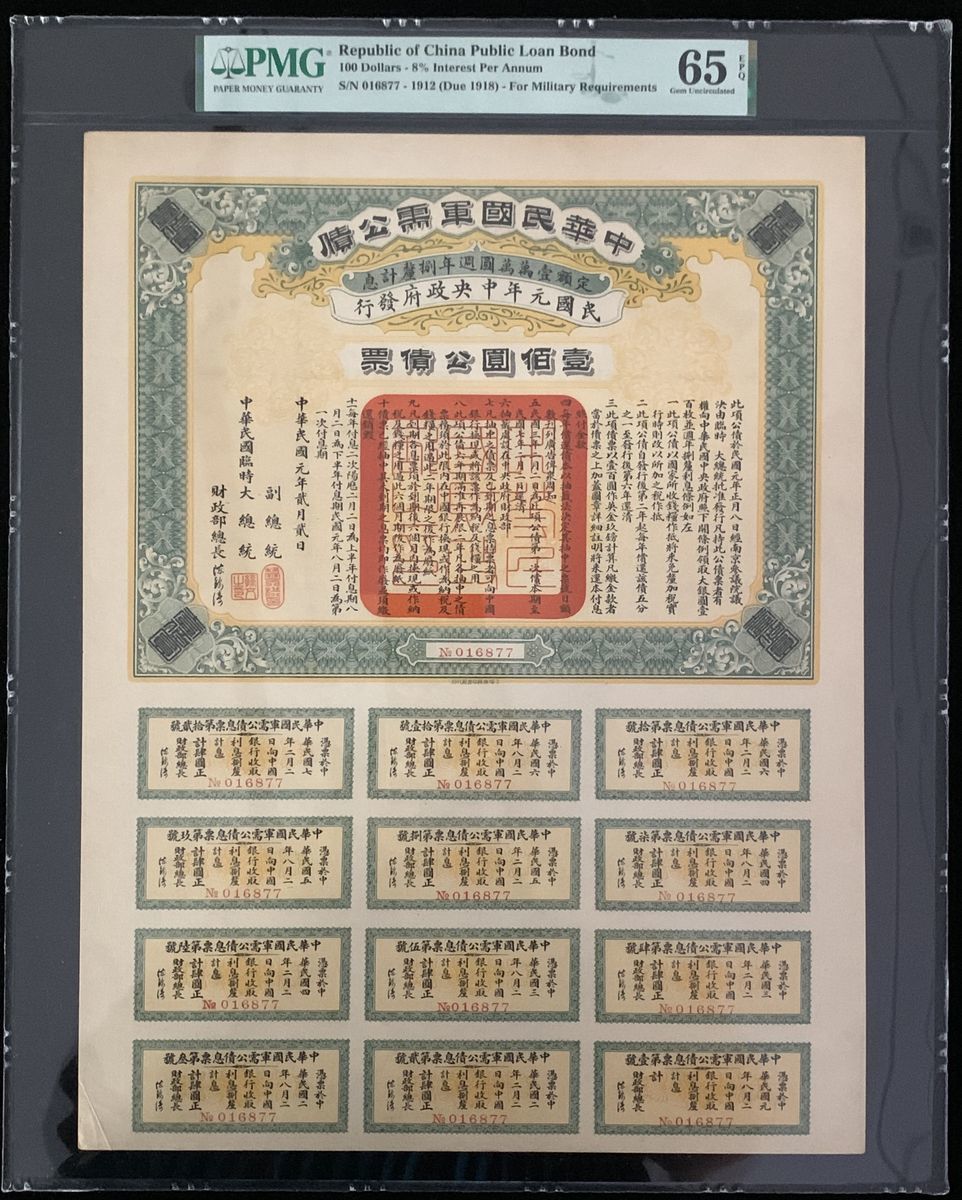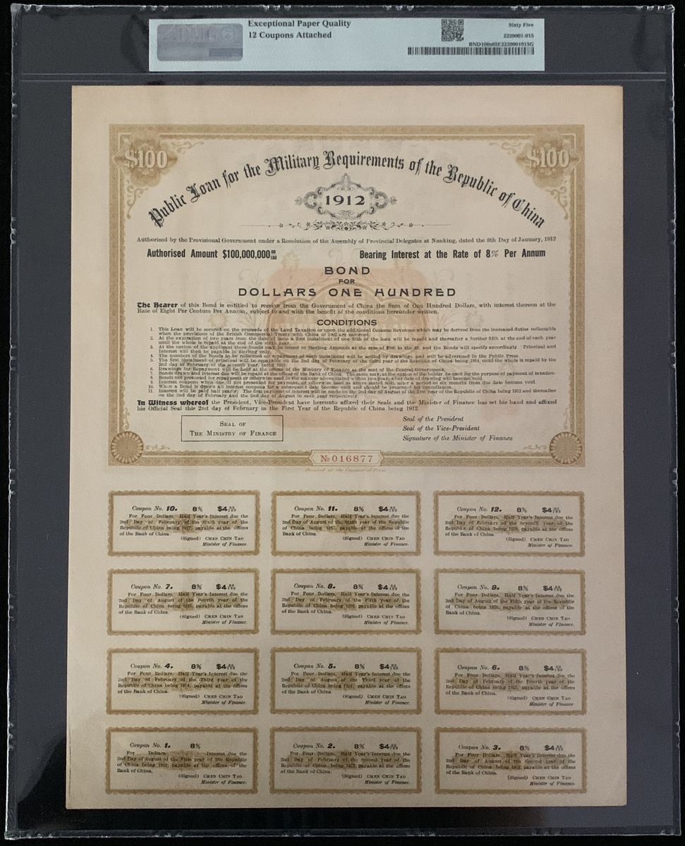 Chinese Government 5% Reorganisation Gold Loan of 1913, £100, serial number 816242, issued by HongKong Shanghai Bank, very fine or so, with coupon attached.