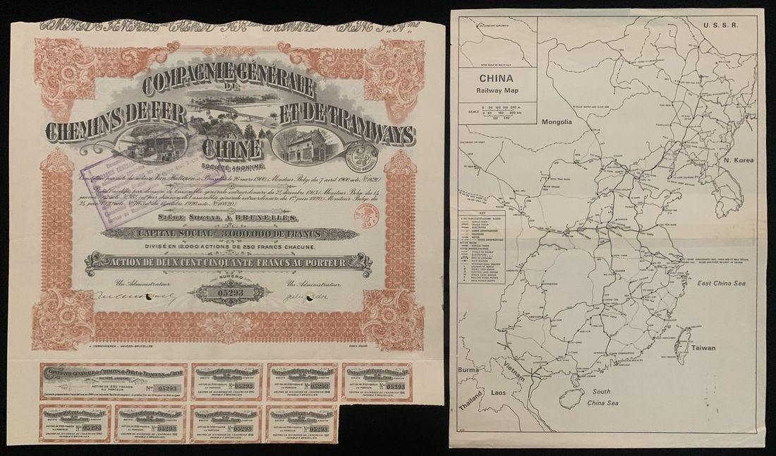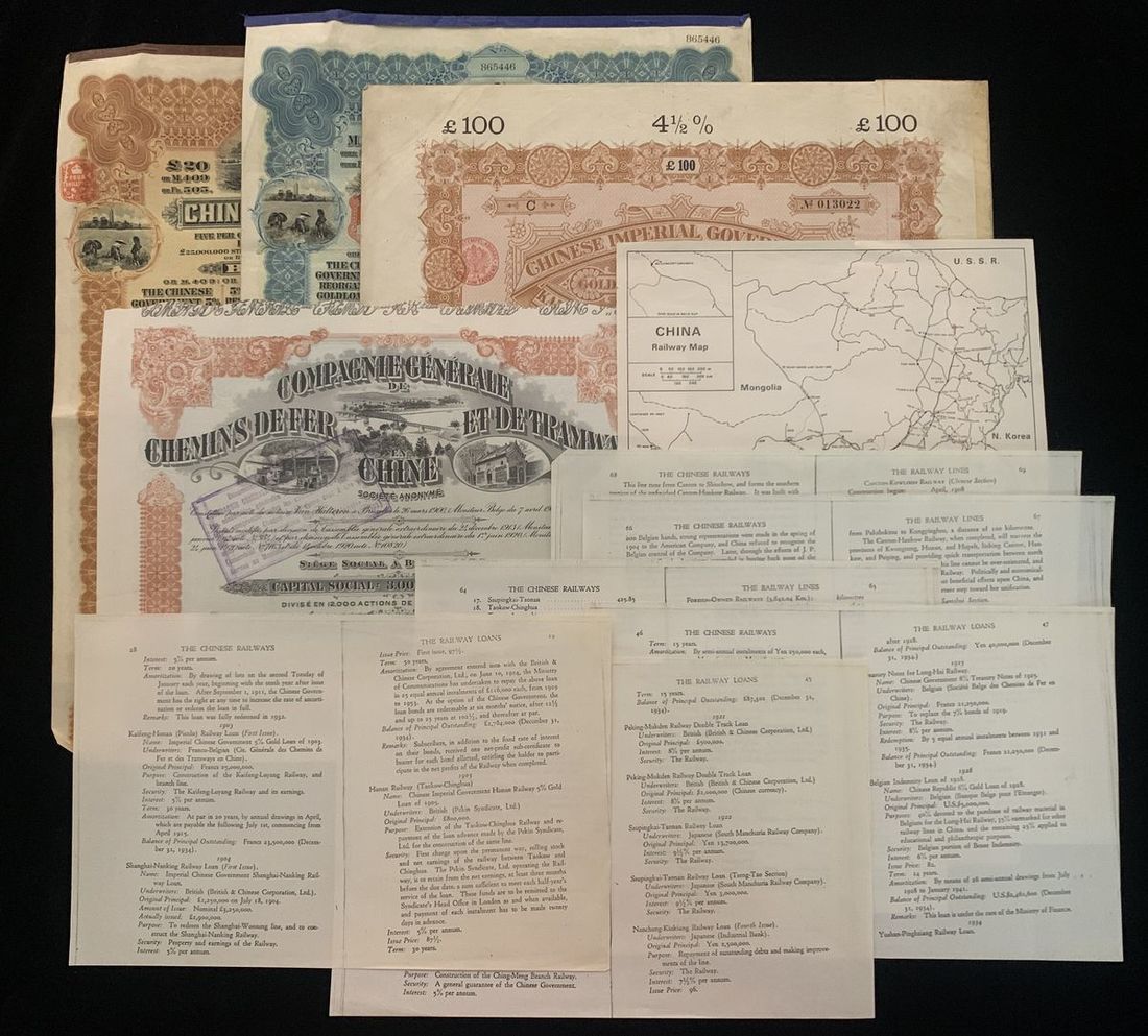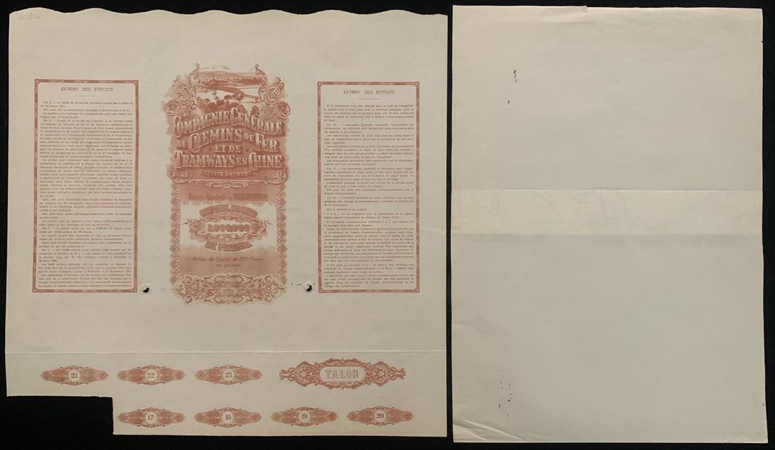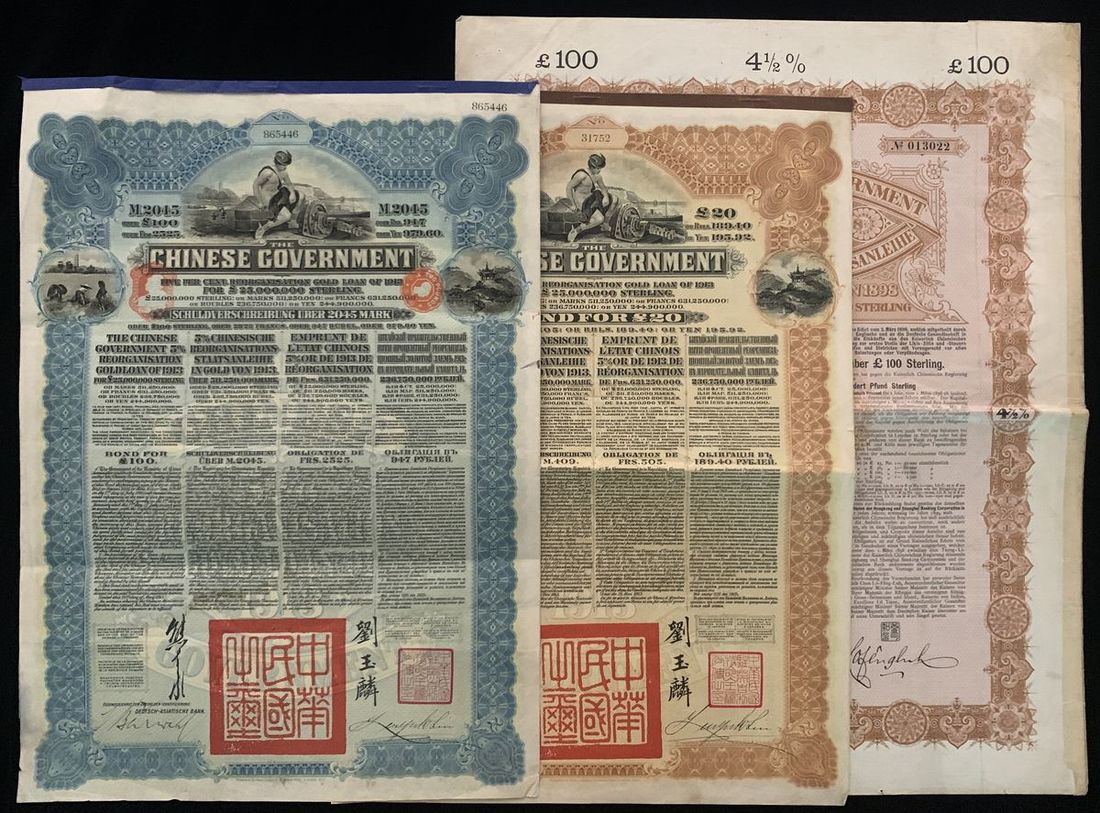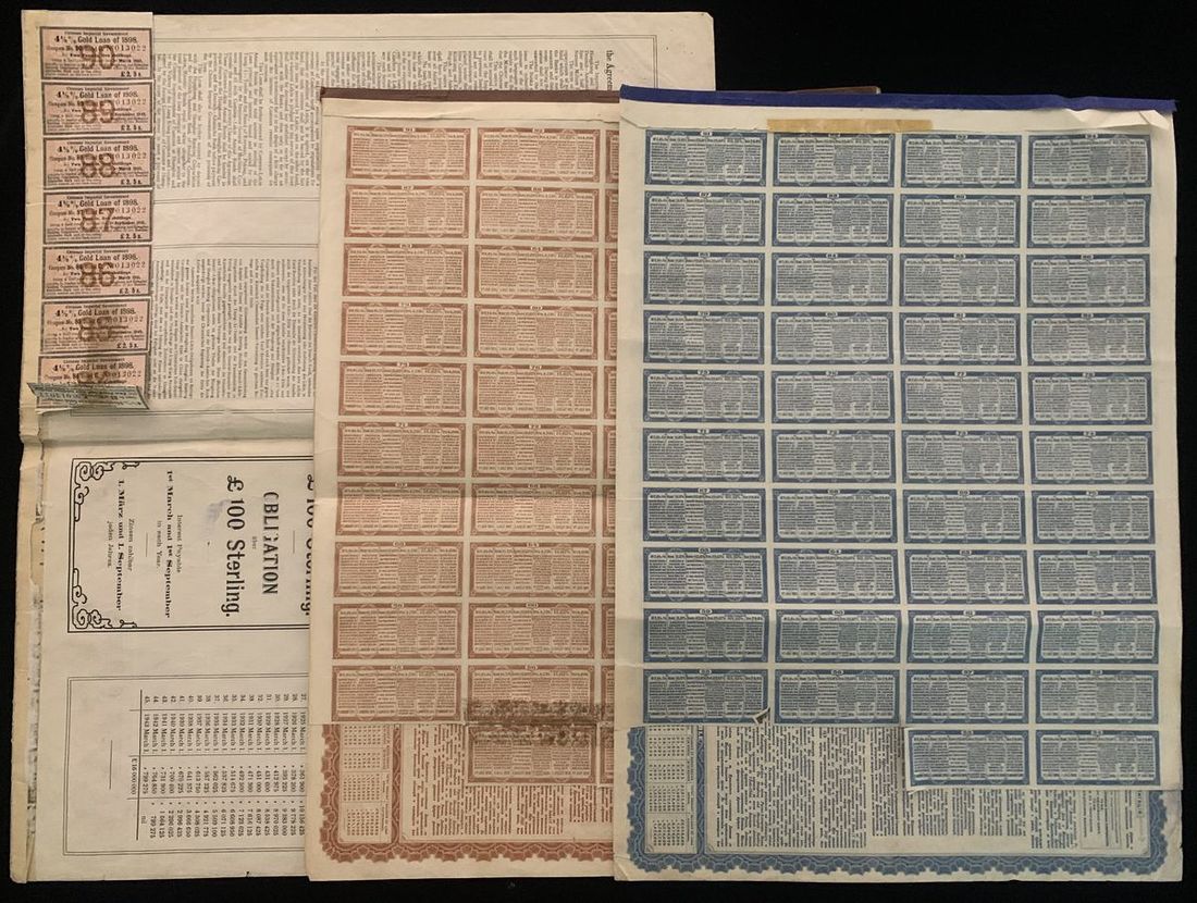 Republic of China, 5% French Industrial Gold Loan, 500 francs, 1914, serial number 010229, extremely fine, with coupons attached.