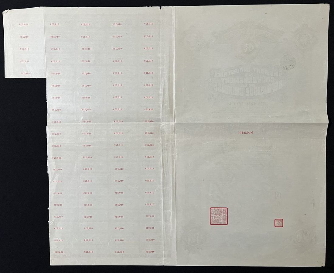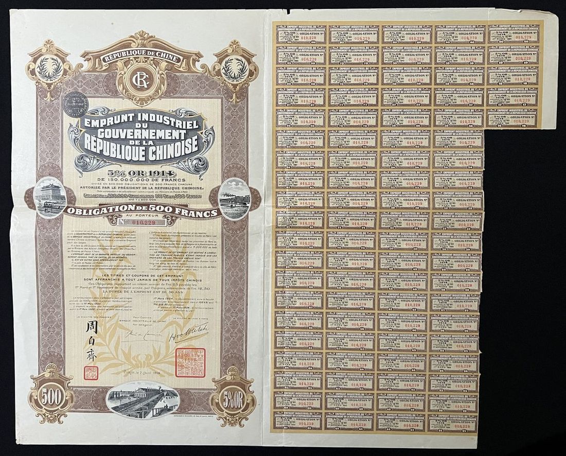 Republic of China, 8% Lung Tsing U Hai Railway Loan, 500 francs, 1920, serial number 059201, with signature of Minister to Belgium Wei ChenZu, and LTUH Railway director,