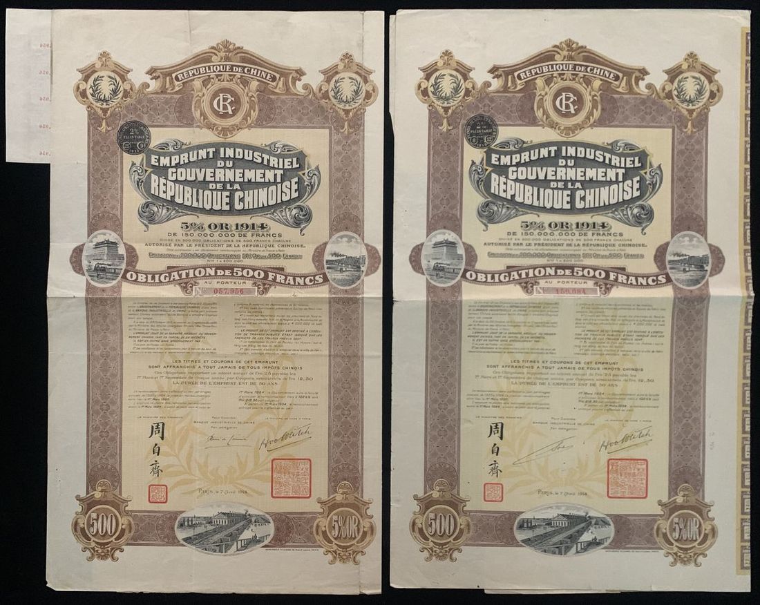 (x) Republic of China, 8% Lung Tsing U Hai Railway Loan, 500 francs, 1921, serial number 093593, with signature of Minister to Belgium Wei ChenZu, and LTUH Railway director,
