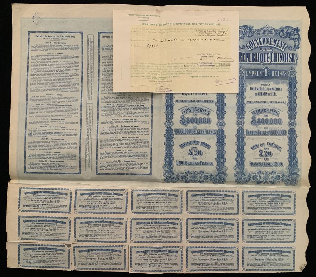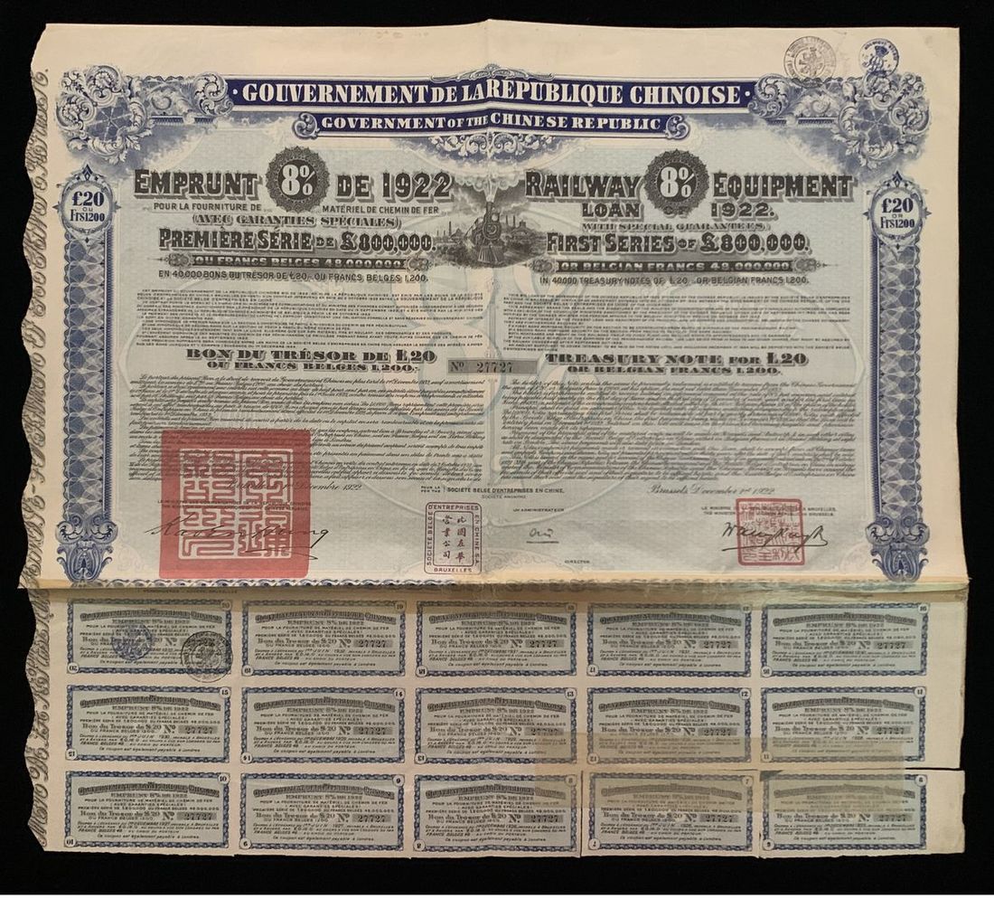 Republic of China Military Public Loan Bond, 5 yuan, 8% Interest per Annum, Year 1 (1912), serial number 051057, with 12 coupons, PMG 50