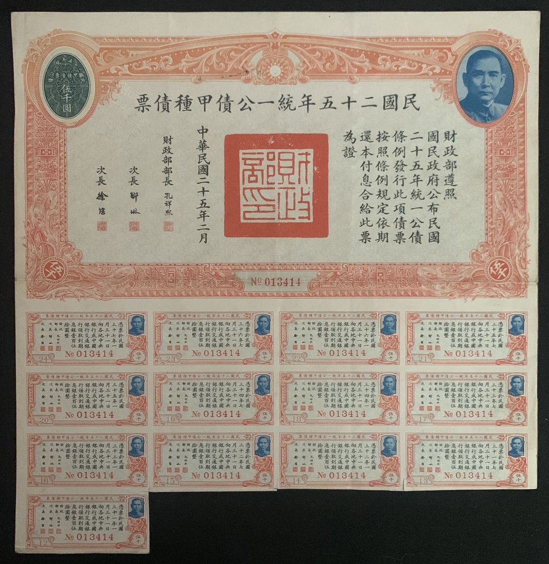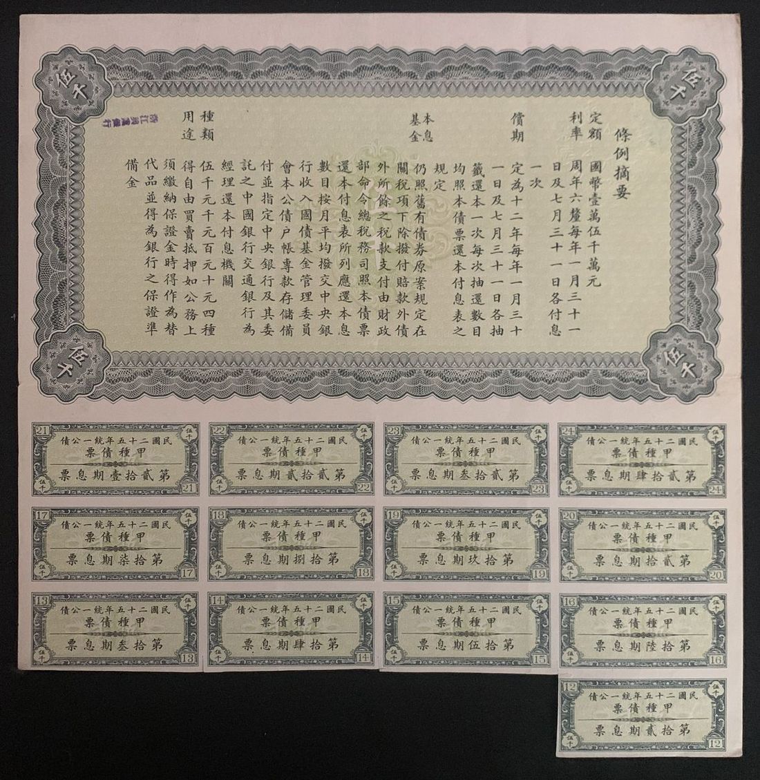 Republican China Liberty Bond, 100 yuan, 4% Annual Interest, Year 26 (1937), serial number 053365, with 29 coupons, PMG 55EPQ