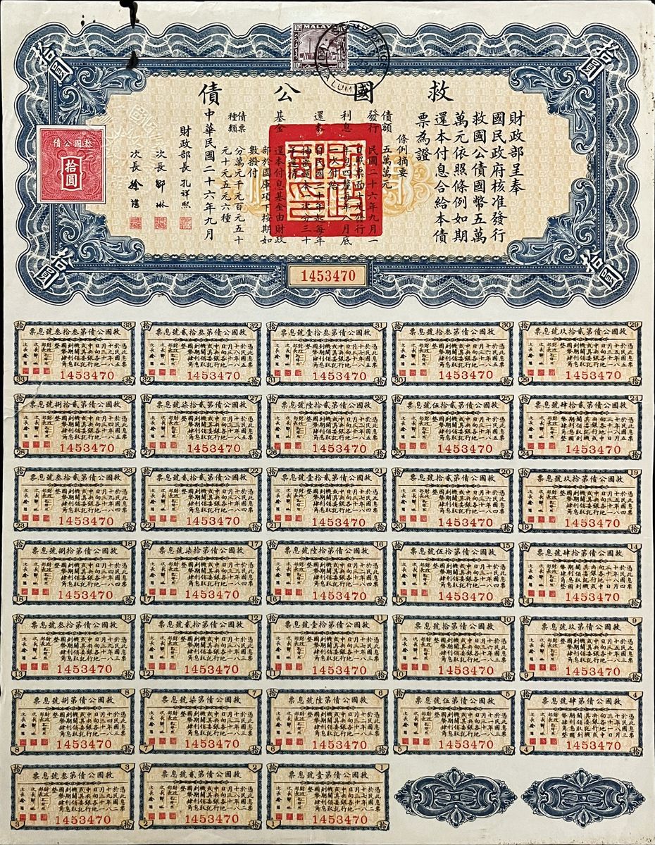 Republican China Liberty Bond, 1000 yuan, 4% Annual Interest, Year 26 (1937), serial number 036487, with 29 coupons, PMG 64