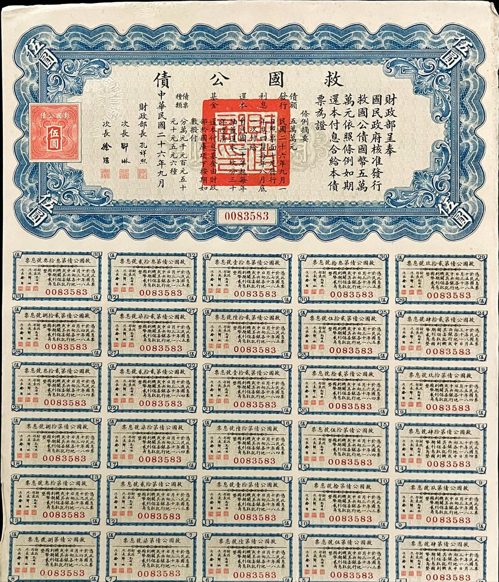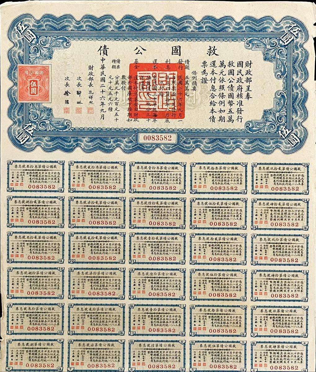 Republican China Liberty Bond, 1000 yuan, 4% Annual Interest, Year 26 (1937), serial number 036486, with 29 coupons, PMG 64