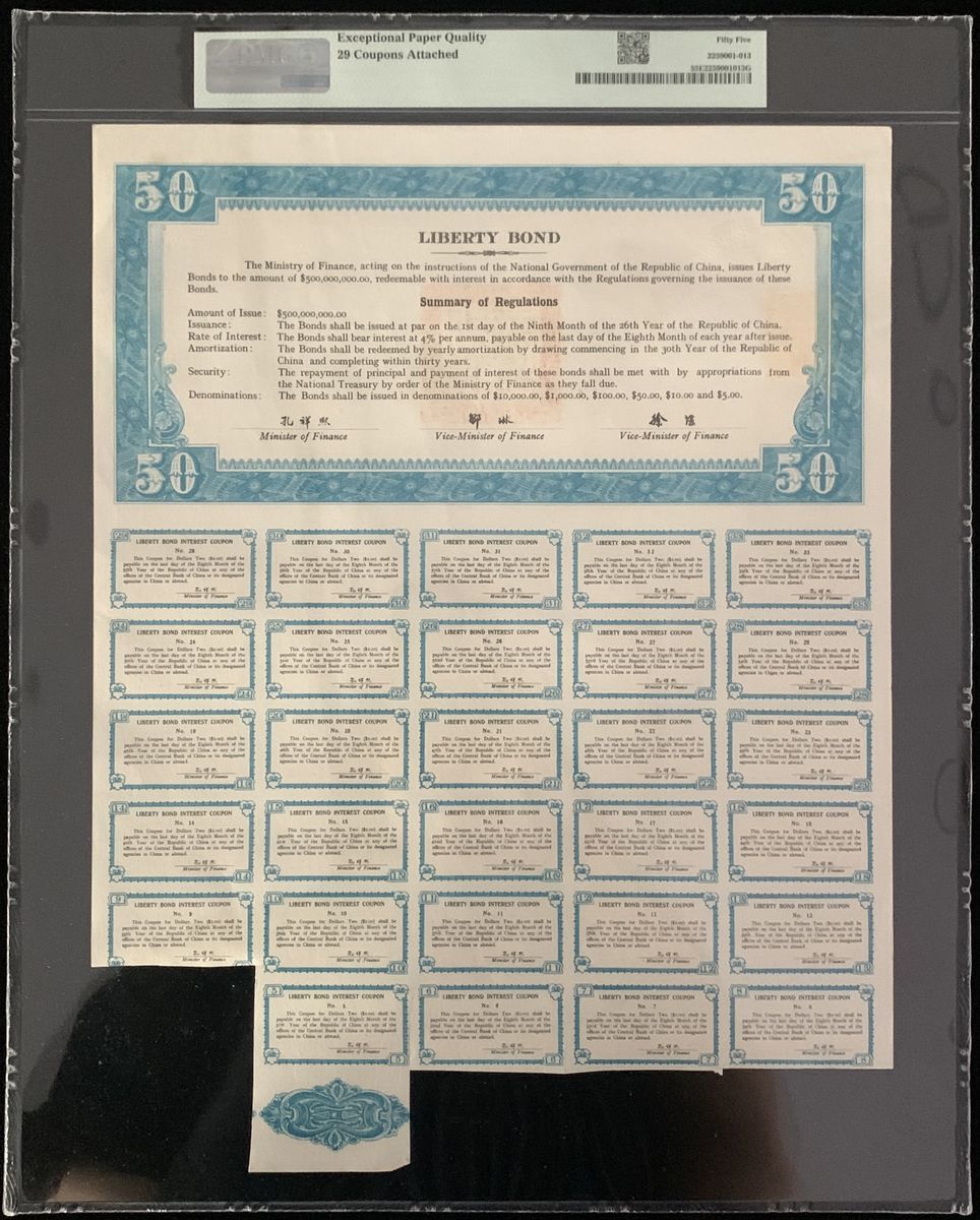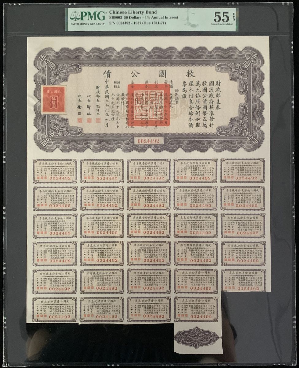 Kwangtung Province National Defence Loan, China, 100 yuan, 4% interest per annum, Year 27 (1938), serial number 006372, with 29 coupons, PMG 64EPQ