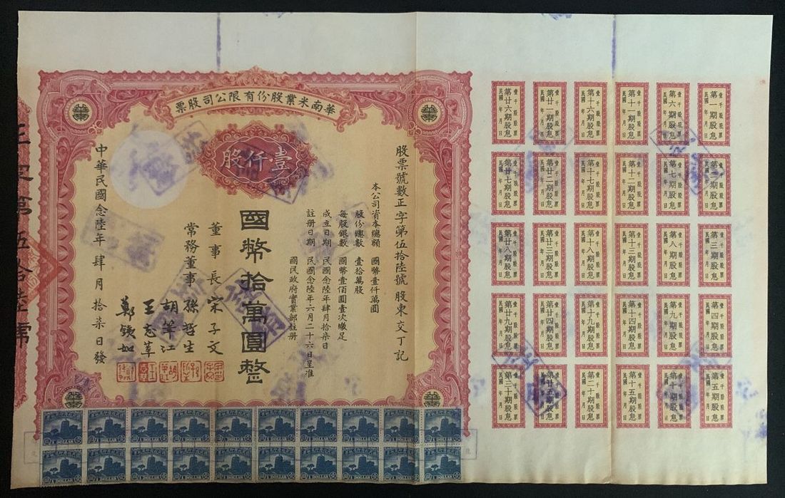 AnHwei Province She County highway Share, China, a share for 1 yuan, Year 29 (1940), serial number 000969, with coupons, stained, extremely fine