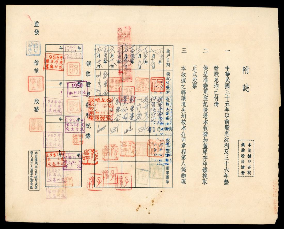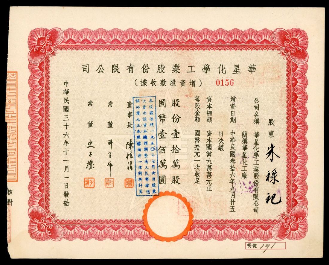 Mei Tai Chemical Industrial Limited, China, a share certificate for 1 share at 25 yuan, Year 32 (1943), serial number 2471, with revenue stamps at top, redeemed stamps at obverse and reverse, stains, about extremely fine