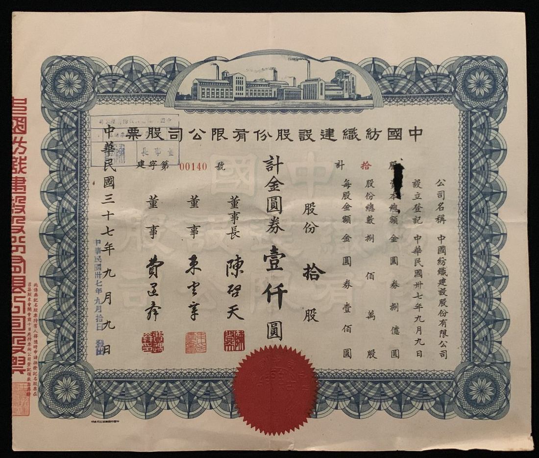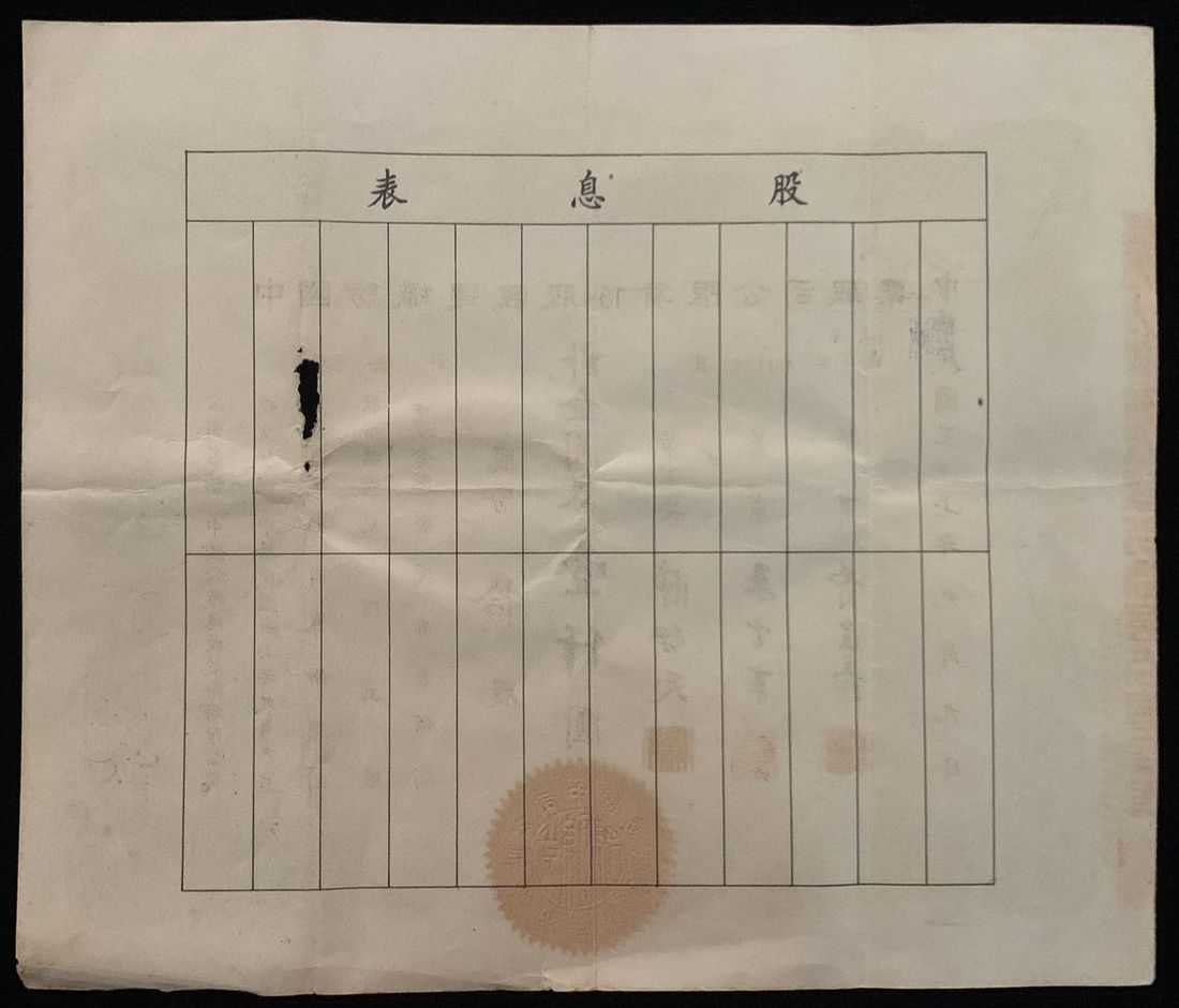 China, Peking Waterworks Company Limited, a share certificate for 6 shares, 60 yuan, Year 24 (1935), with revenue stamps at top, extremely fine. With original envelope (2)