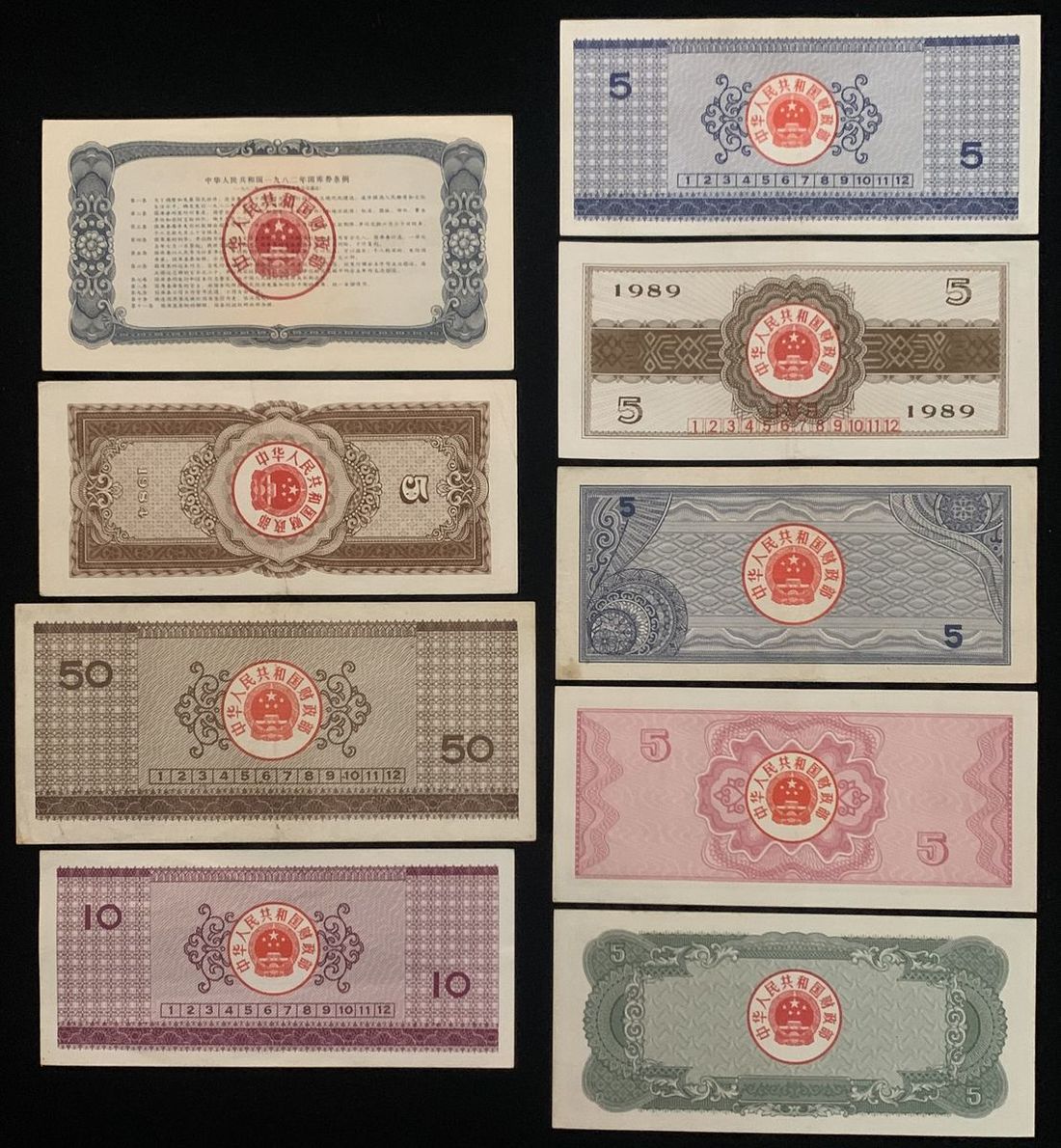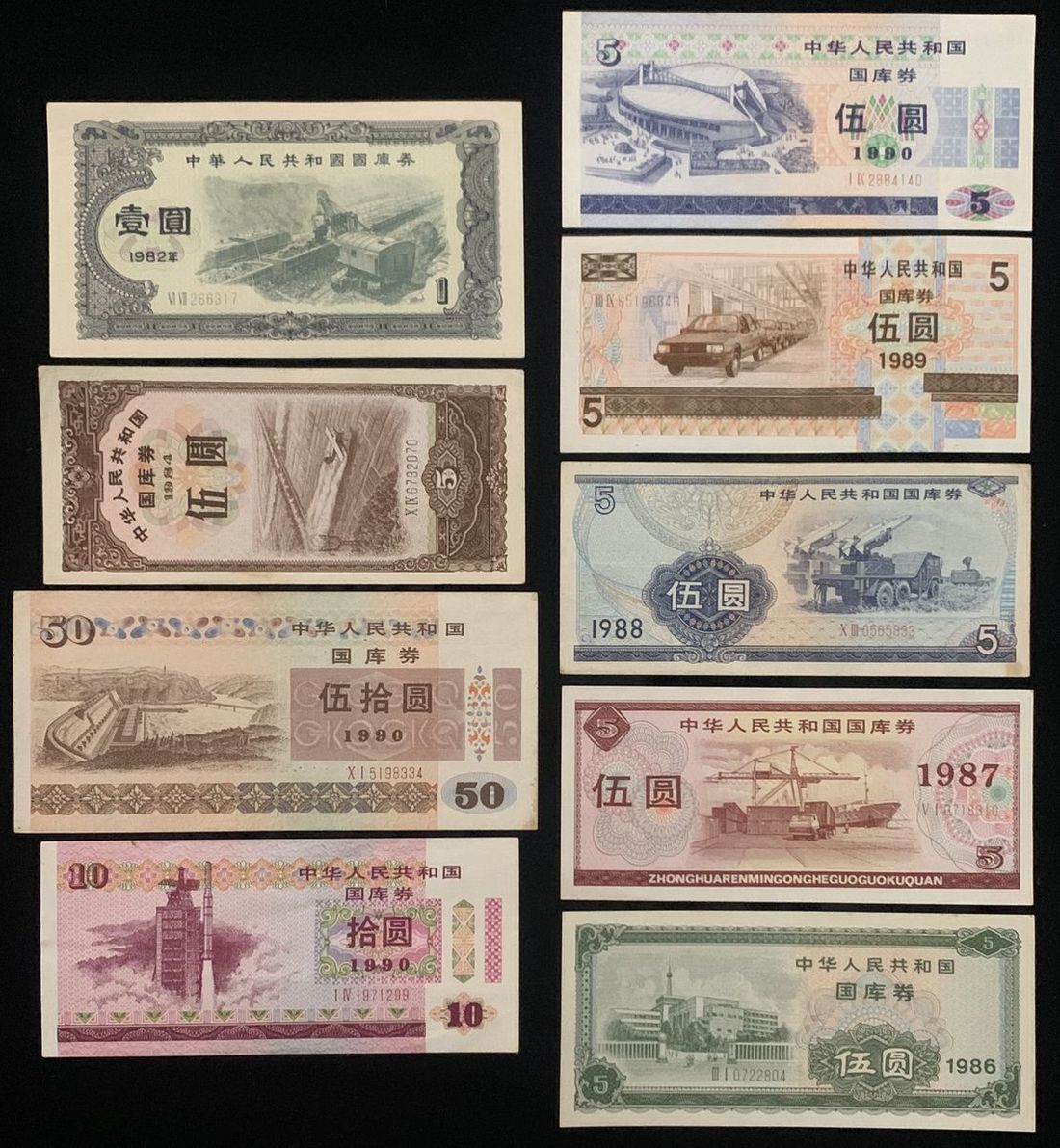 People's Republic of China, a group of 9x treasury securities, including: 1982 1 yuan, 1984 5 yuan, 1990 50 yuan, 1990 10 yuan, 1990 5 yuan, 1989 5 yuan, 1988 5 yuan, 1987 5 yuan, 1986 5 yuan,