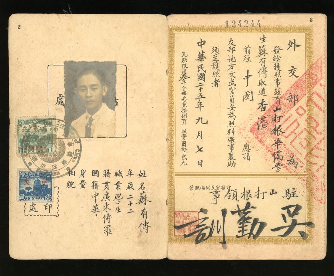 Republic of China, passport issued in Year 25 (1936), issued for Soo Yew Chiun, for travelling from Sandakan to China via Hong Kong, with various official stamps from China and Hong Kong,