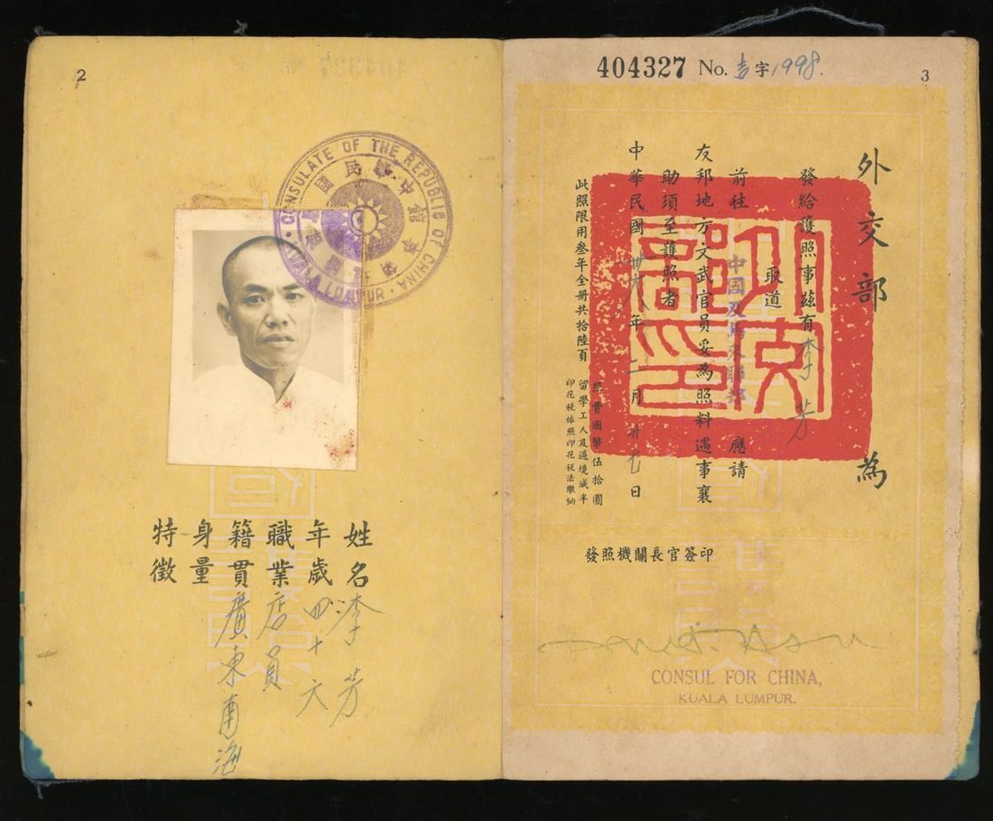 Republic of China, passport issued in 1947, issued for Lee Foong, for going to China and Malayan Union via Singapore and Hong Kong,