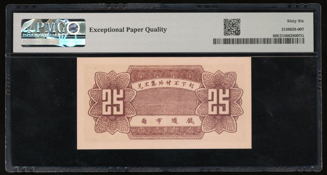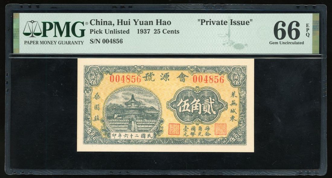 Hui Yuan Hao, Private Issue, China, Private Issue 25 Cents,Year 26(1937), serial number 004856, (Pick Unlisted), PMG 66EPQ Gem Uncirculated