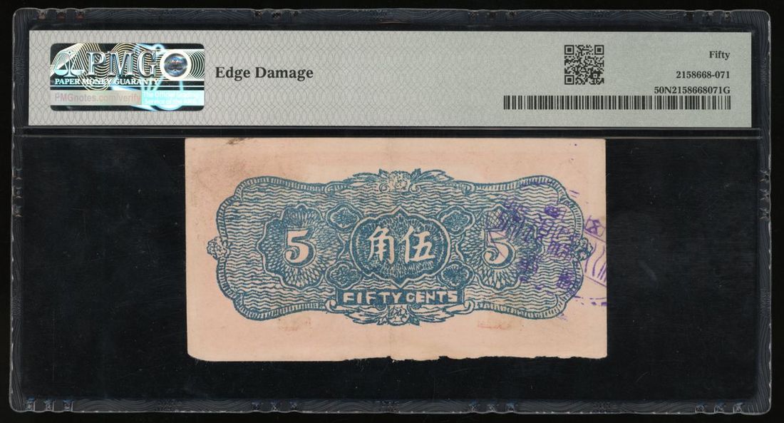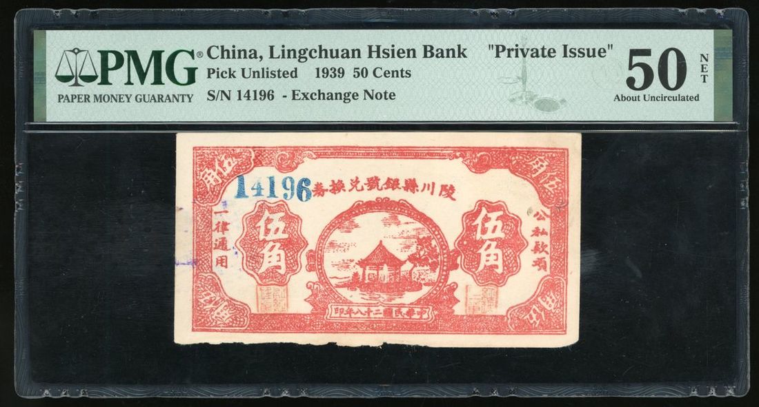Lingchuan Hsien Bank, Private Issue, China, Private Issue, Exchange Note 50 Cents, Year 28 (1939), serial number 14196, (Pick Unlisted), PMG 50NET About Uncirculated