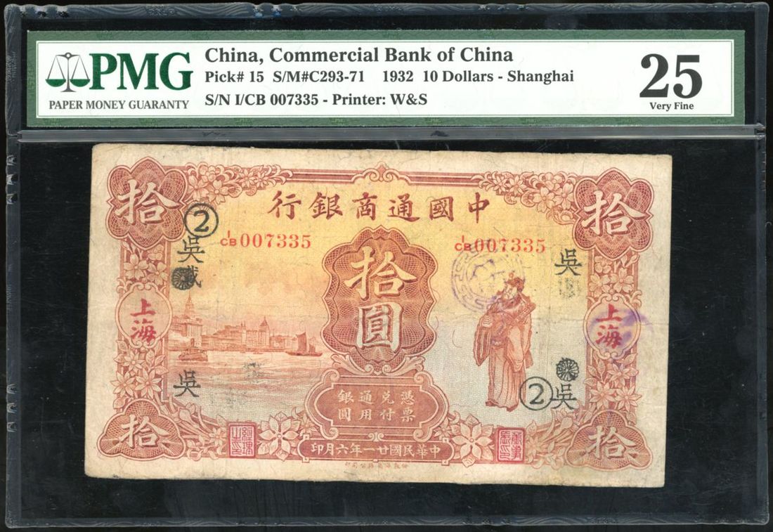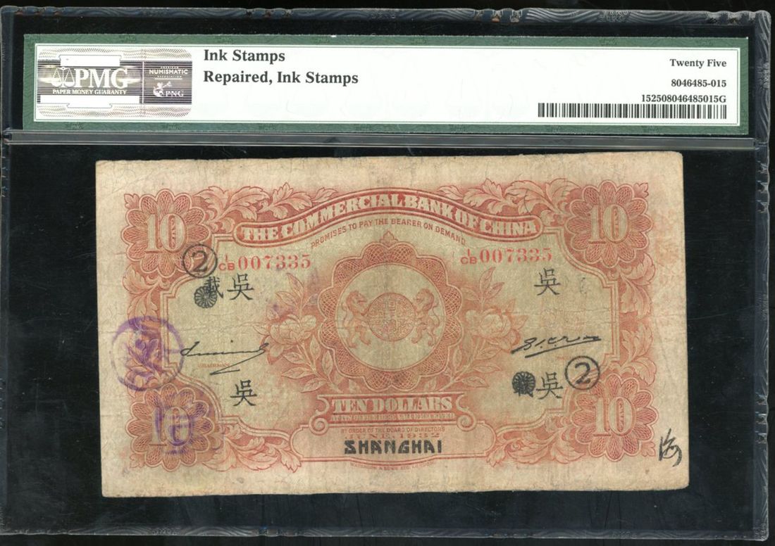 Commercial Bank of China, $10, Shanghai, Year 21(1932), serial number I/CB 007335, (Pick 15), PMG 25 Very Fine (Ink Stamps, Repaired).