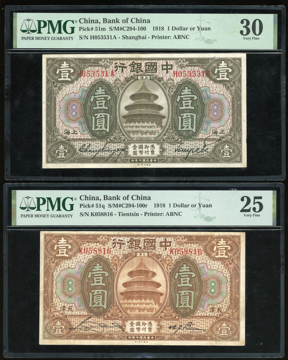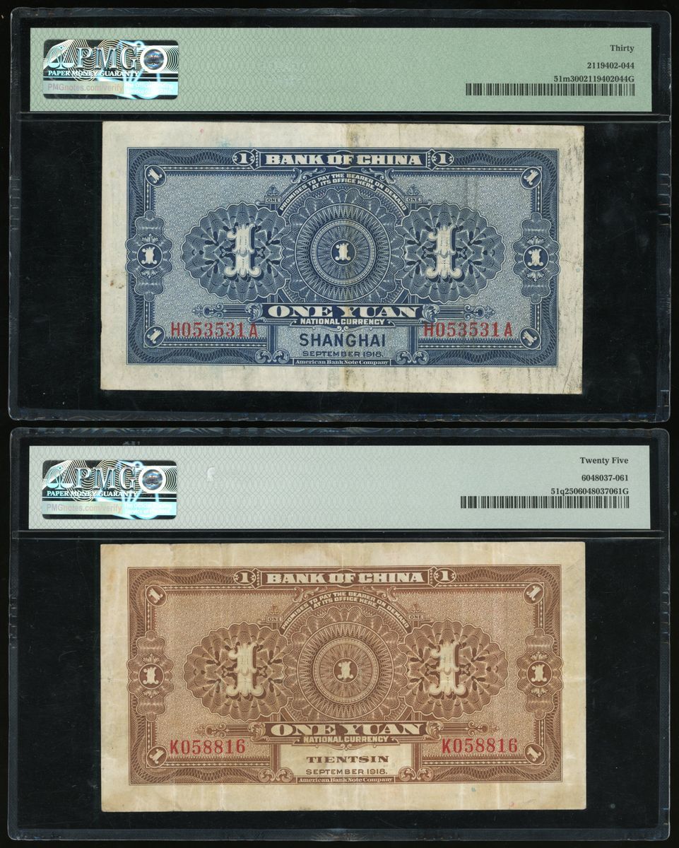 Bank of China, a group of 3 notes, consists of 2x 1 yuan, Shanghai and Tientsin, Year 7(1918), 10 yuan, Year 23(1934), serial numbers H053531A, K058816 and F798714, (Pick 51m, 51q and 73), graded PMG 30, 25 and 35 respectively (3).