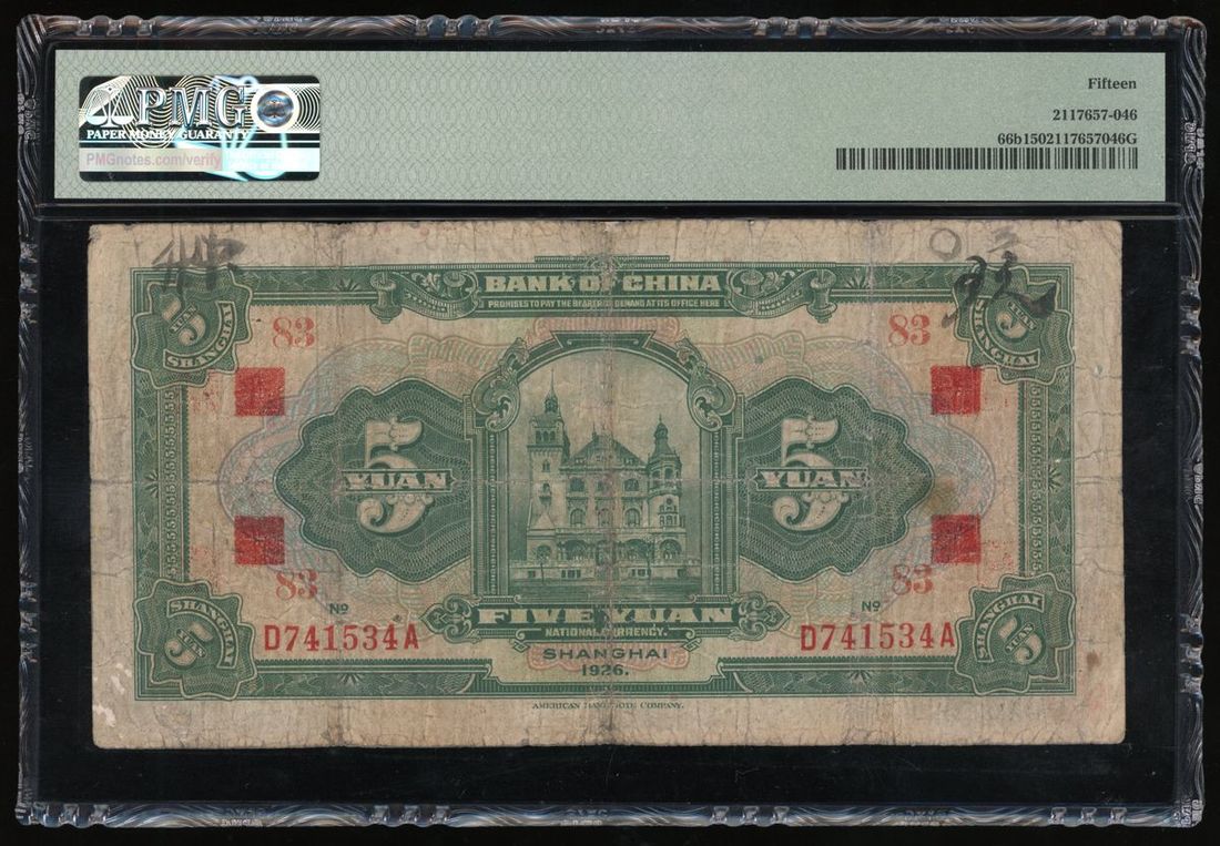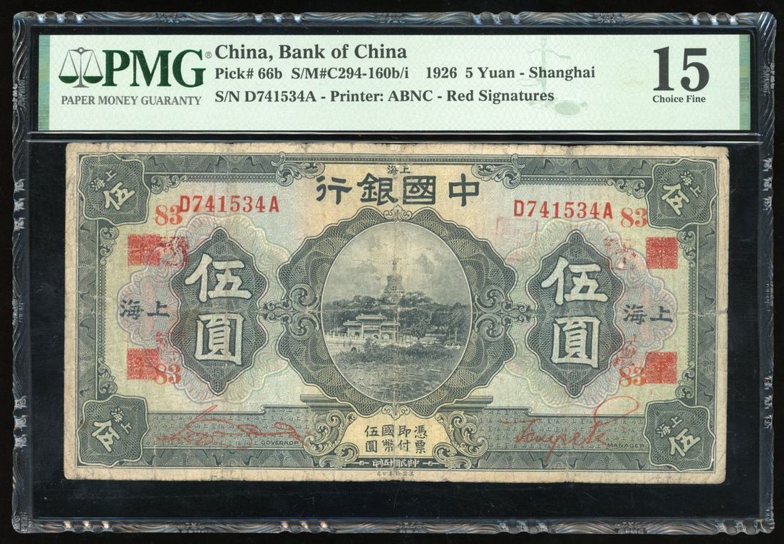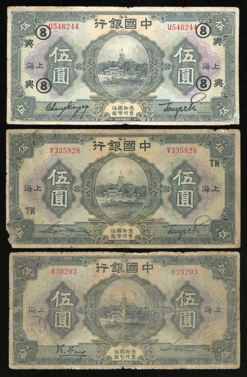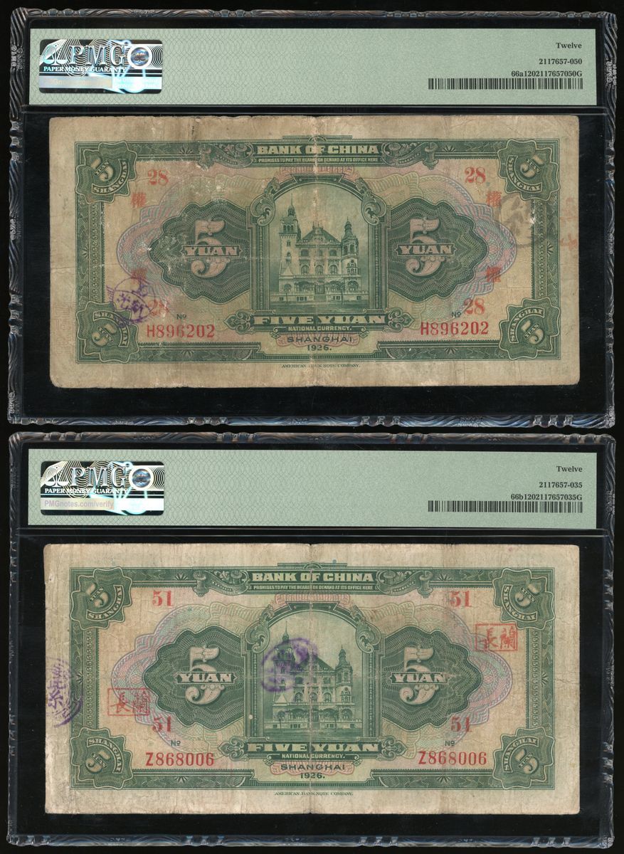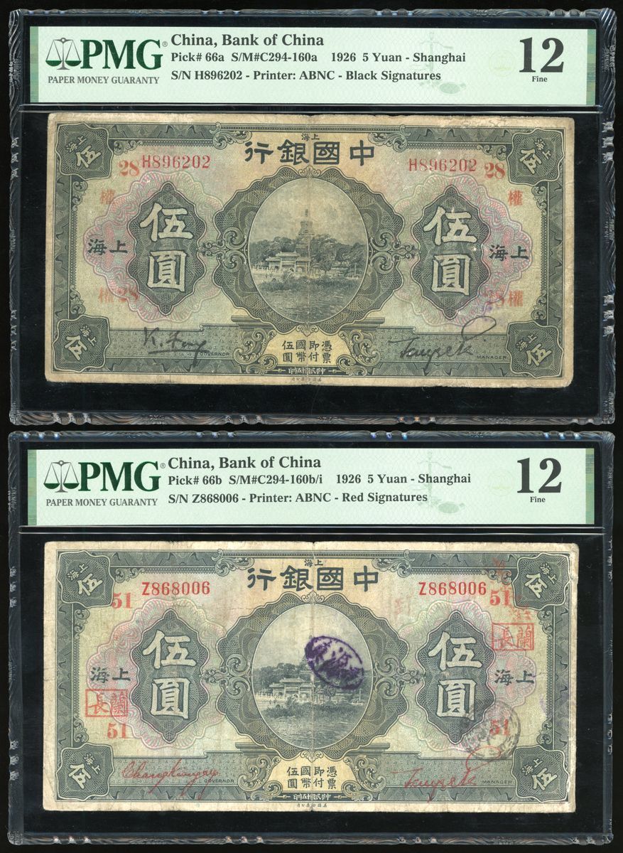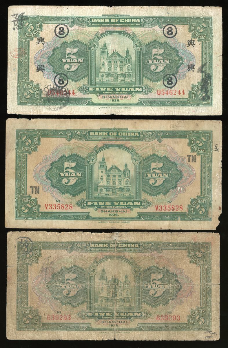 Bank of China, a group of 6x 5 yuan, Shanghai, Year 15(1926), serial numbers H896202, 639293, V335828, U546244, D741534A and Z868006, various red stamps, 4 with black signature and 2 with red signature,