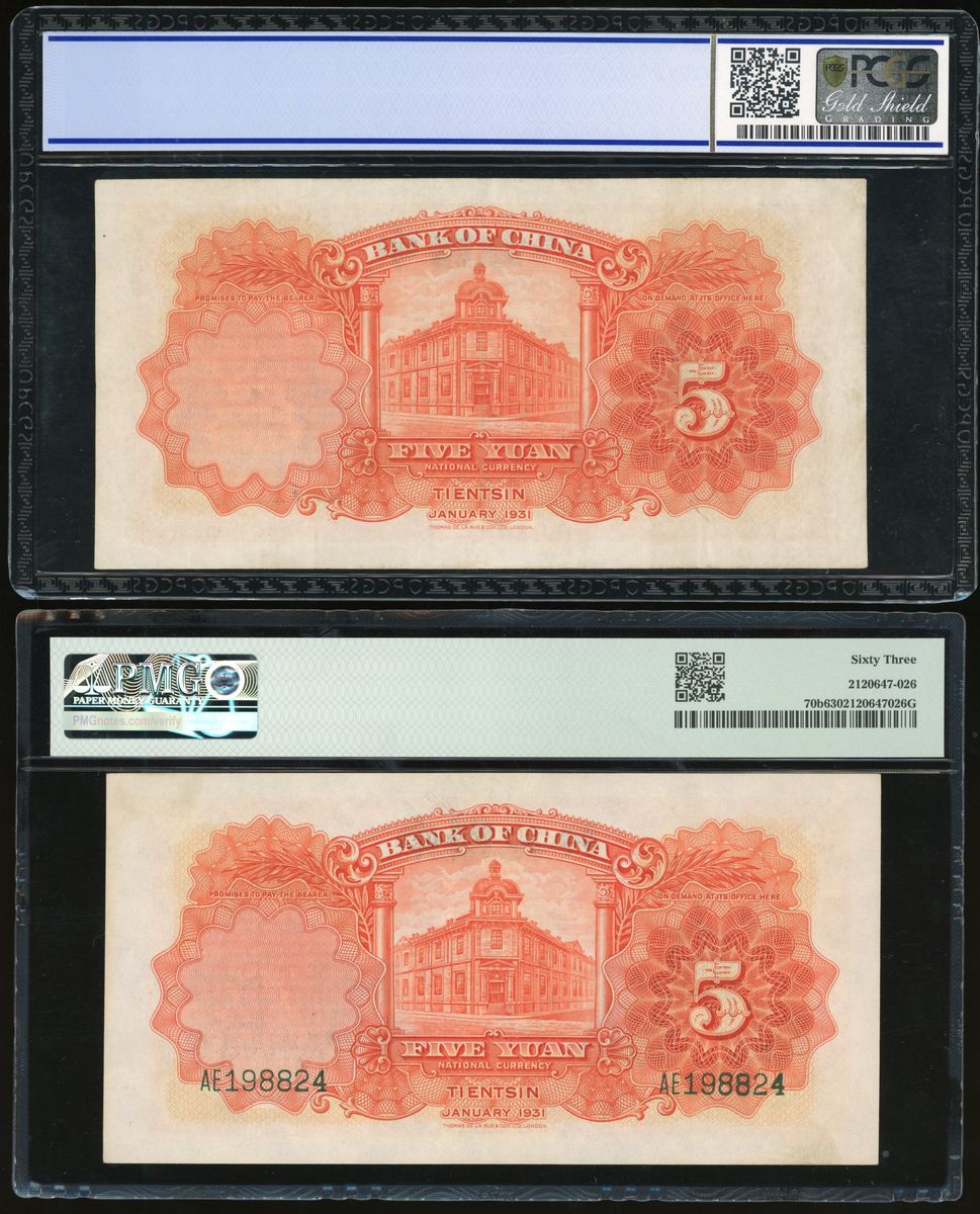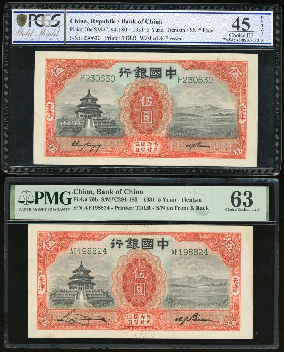 Bank of China, a pair of 5 yuan, Year 20(1931), serial numbers F230630 and AE198824, (Pick 70a and 70b), graded PCGS Gold Shield 45 (Washed and Pressed) and PMG 63 respectively (2)