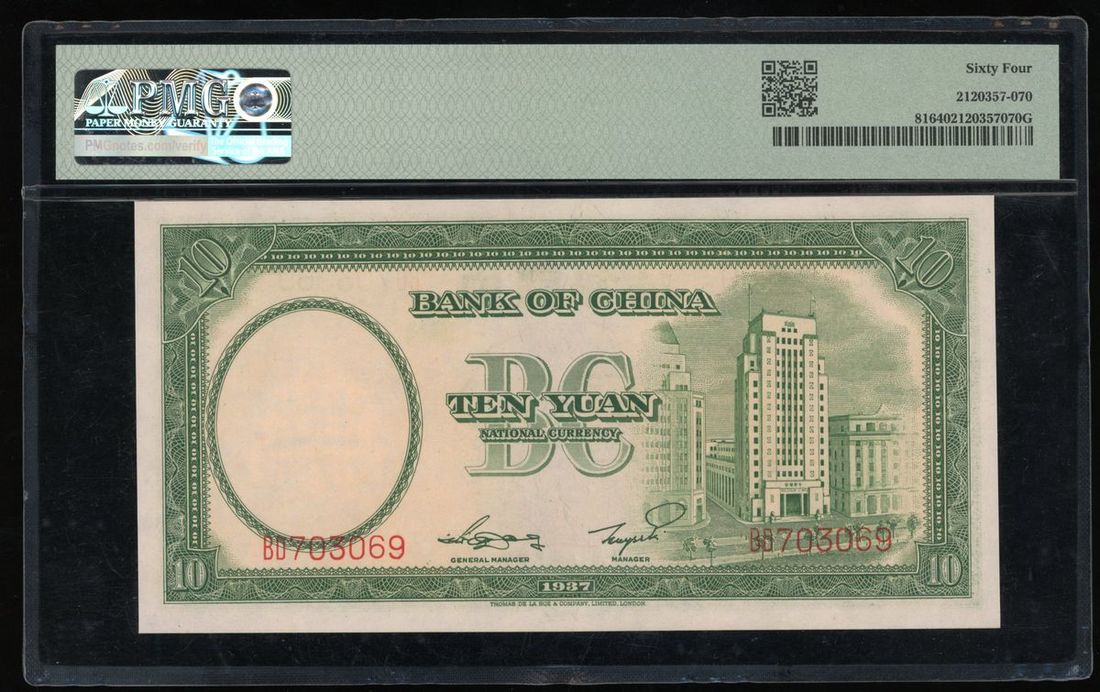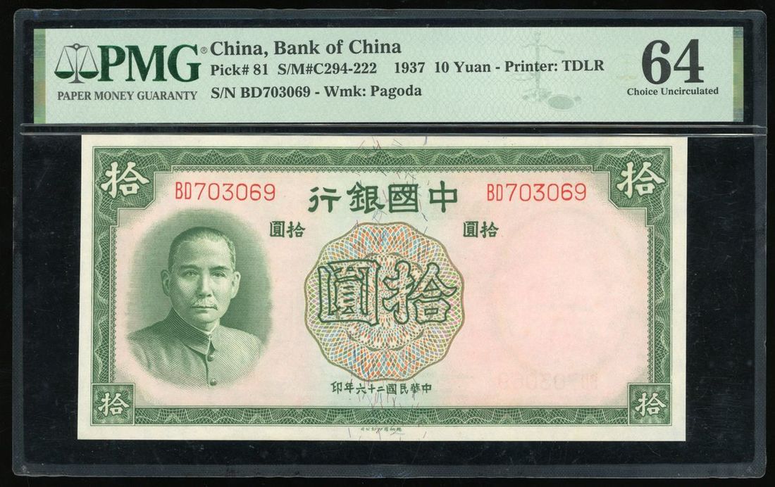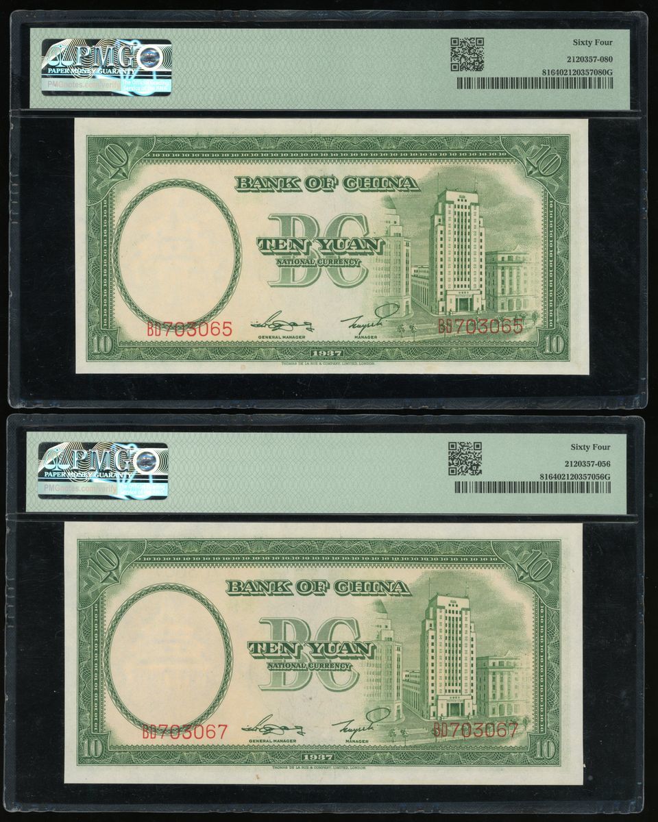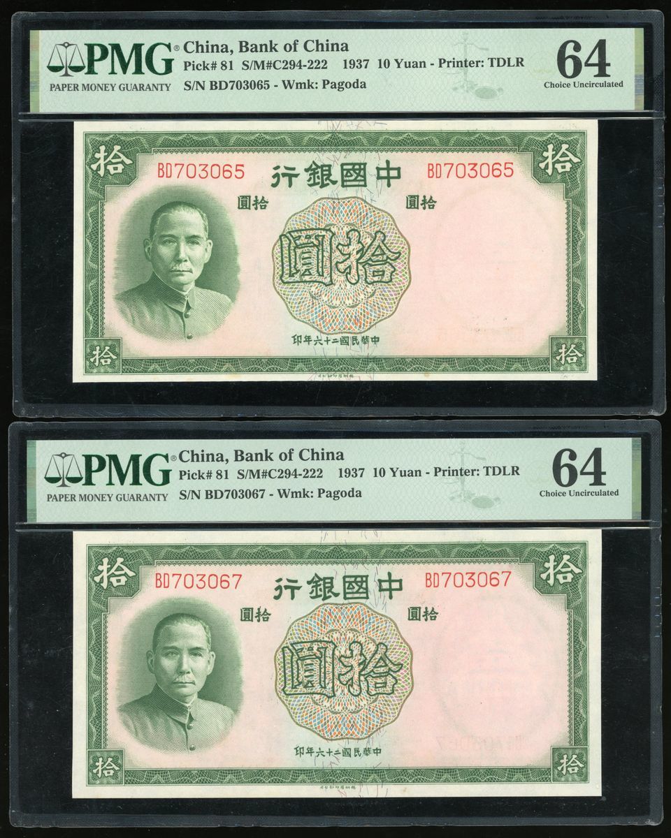 Bank of China, 10 Yuan (3), 1937, serial numbers BD703065, BD703067, BD703069, (Pick 81), PMG 64 Choice Uncirculated (3)