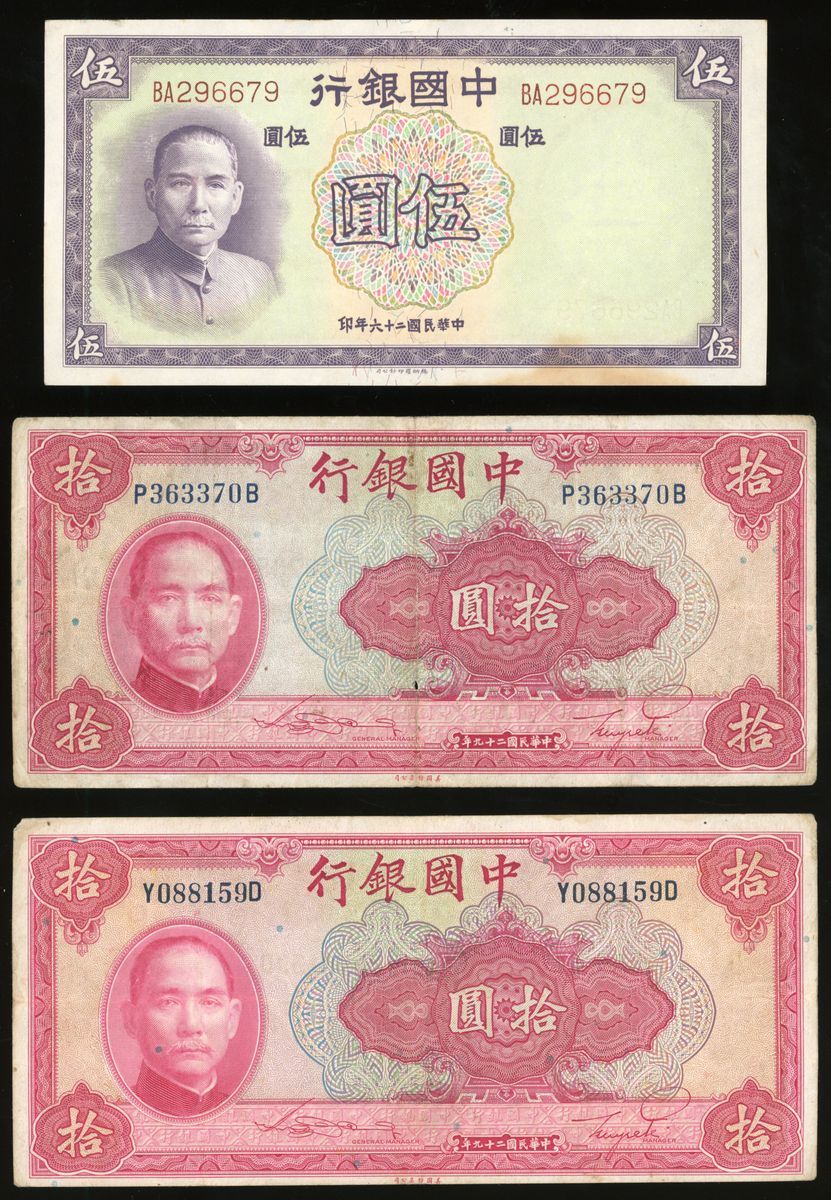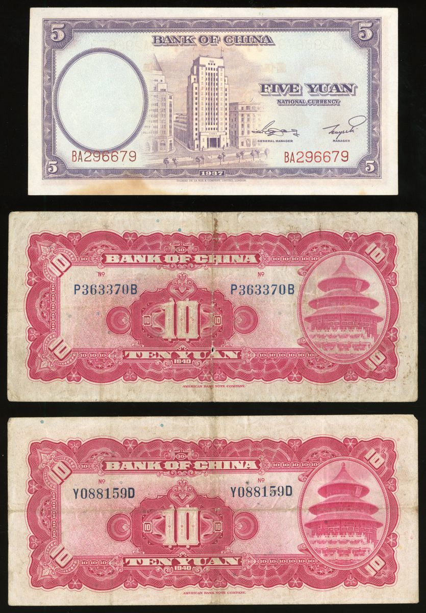 Bank of China, a group of 3 notes, consists of 5 yuan, Year 26(1937), and a pair of 10 yuan, Year 29(1940), serial numbers BA296679, P363370B and Y088159D, (Pick 80 and 85b), fine to very fine, with stains (3).