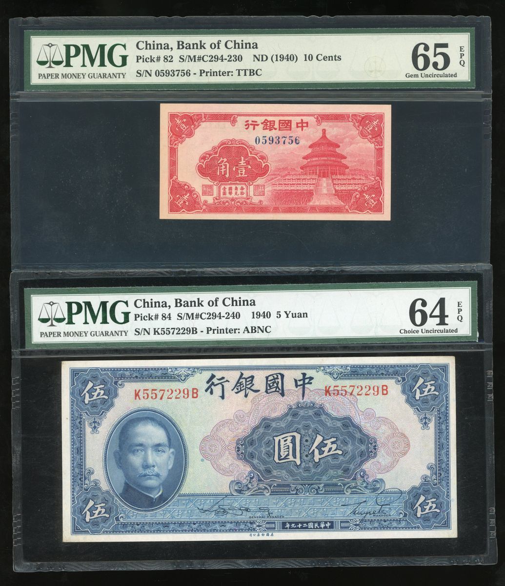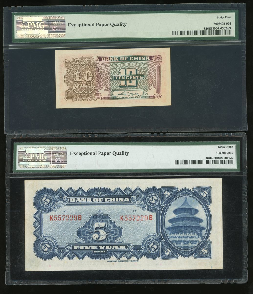 (x) Bank of China, a pair, including 10 cents and 5 yuan, 1940, (Pick 82, 84), PMG 65EPQ and 64EPQ respectively (2)