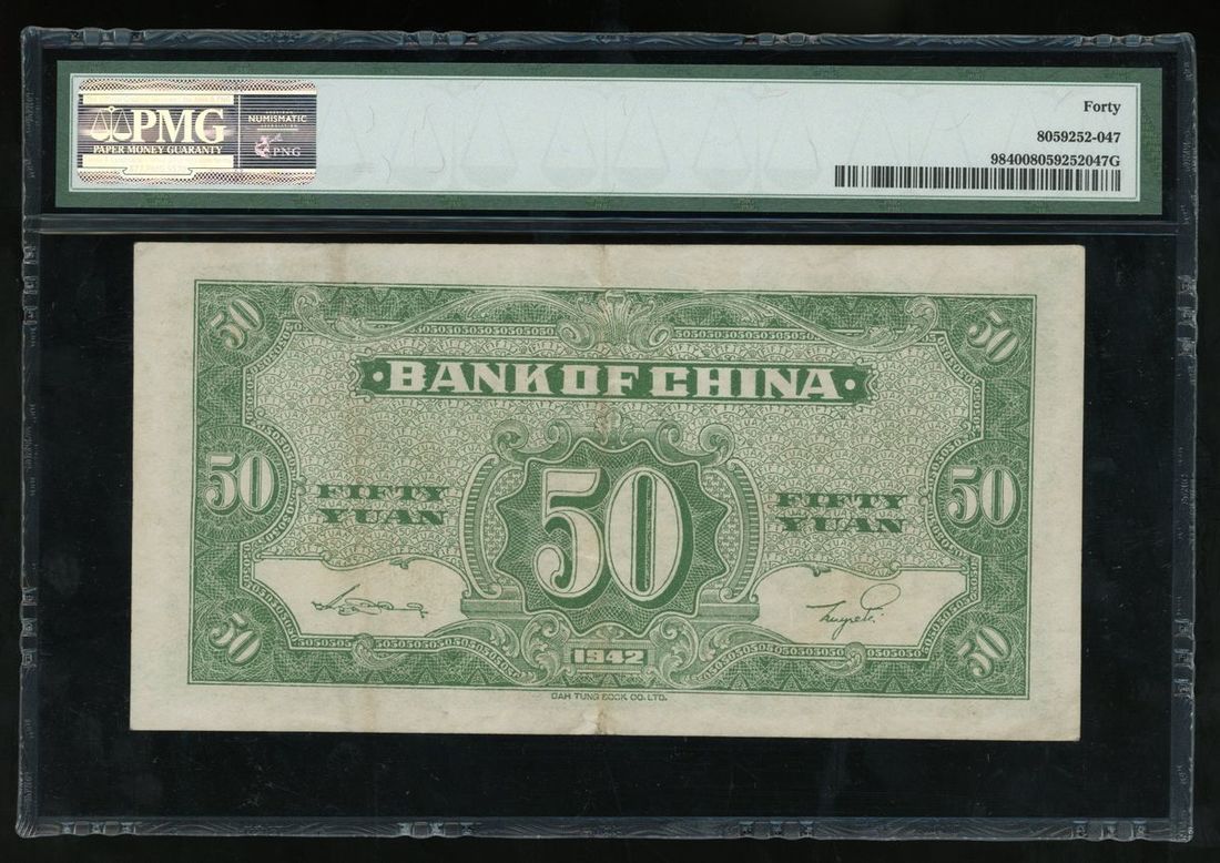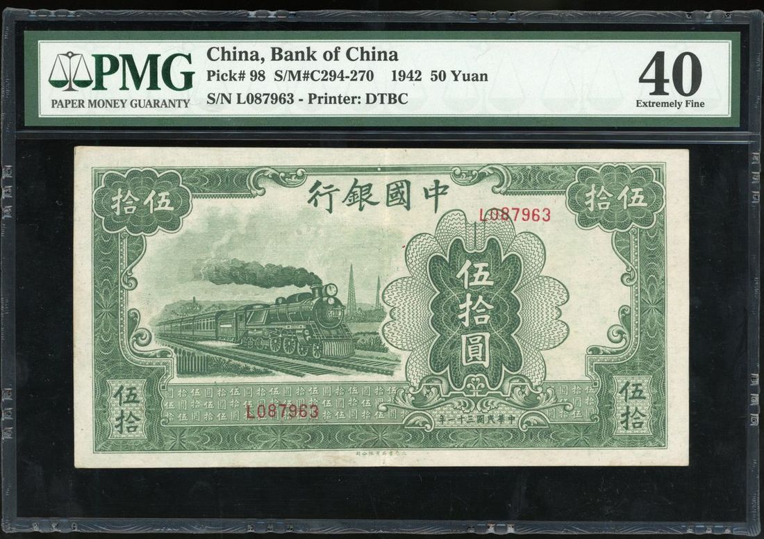 Bank of China, 50 Yuan, 1942, serial number L087963, green, train at left,