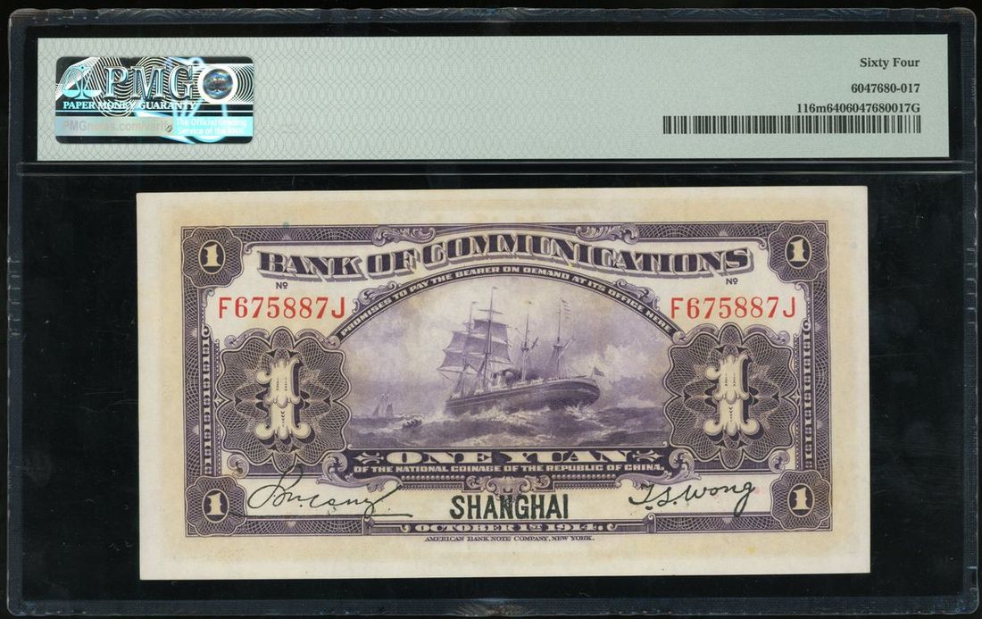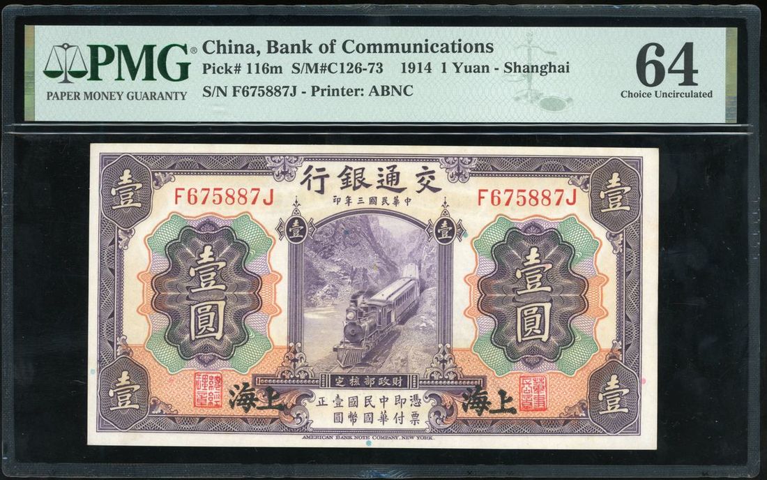 Bank of Communications, China, 1 yuan, Shanghai, Year 3(1914), serial number F675887J, (Pick 116m), PMG 64 Choice Uncirculated