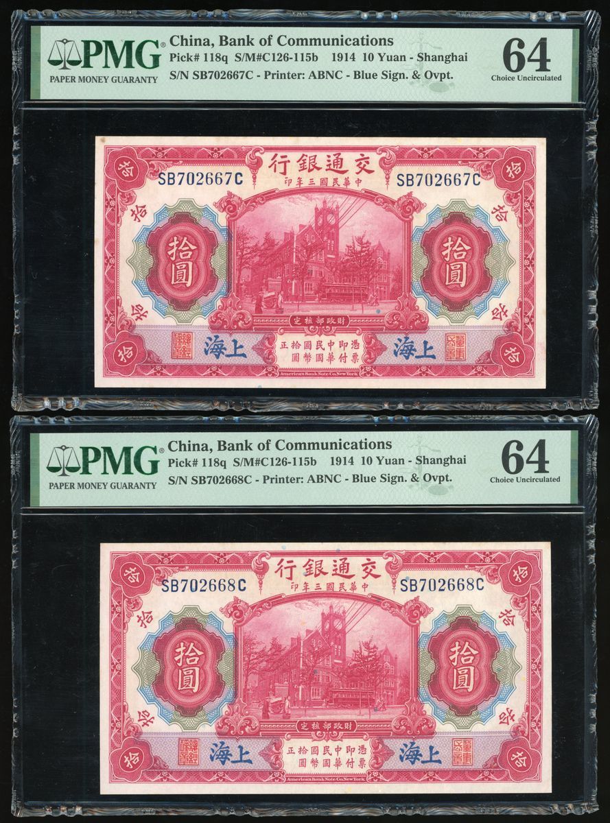 Bank of Communications, China, a group of 5x 10 yuan, 1914 and 1941, serial numbers SB702667C-670C and XA667640, (Pick 118q, 158), all graded PMG 64 Choice Uncirculated (5)