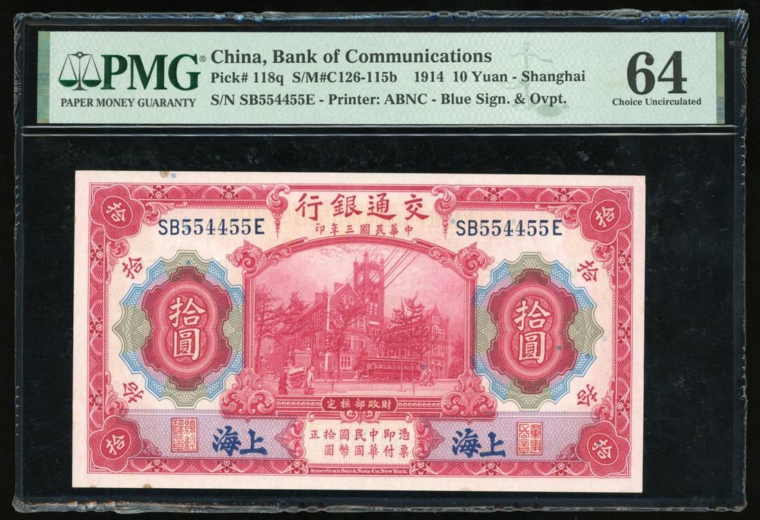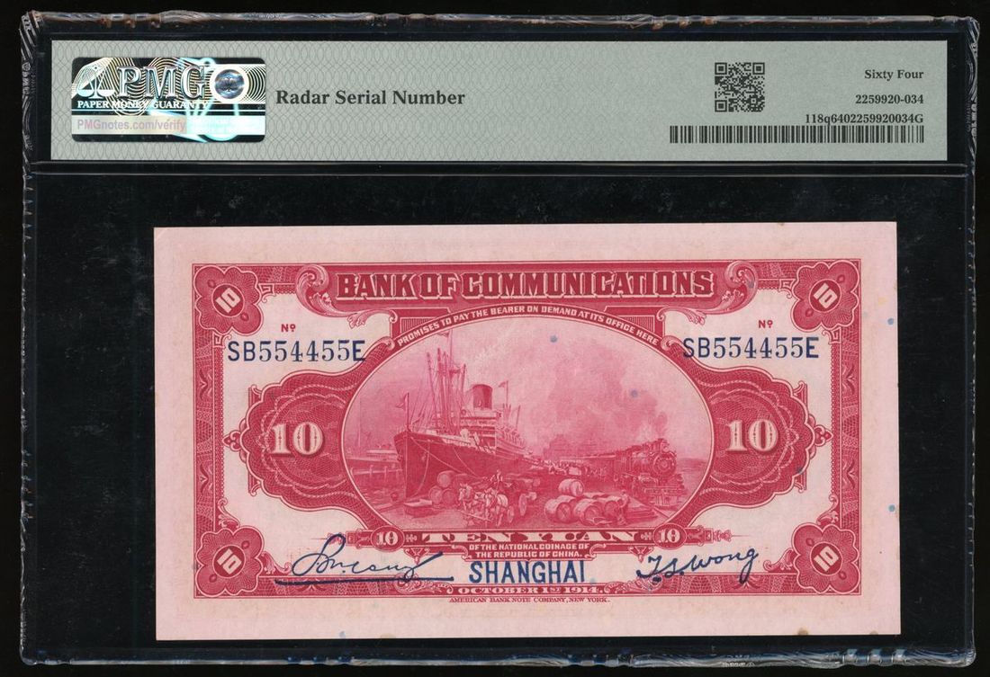 Bank of Communciations, China, 10 yuan, Shanghai, Year 3(1914), radar serial number SB554455E, (Pick 118q), PMG 64 Choice Uncirculated.