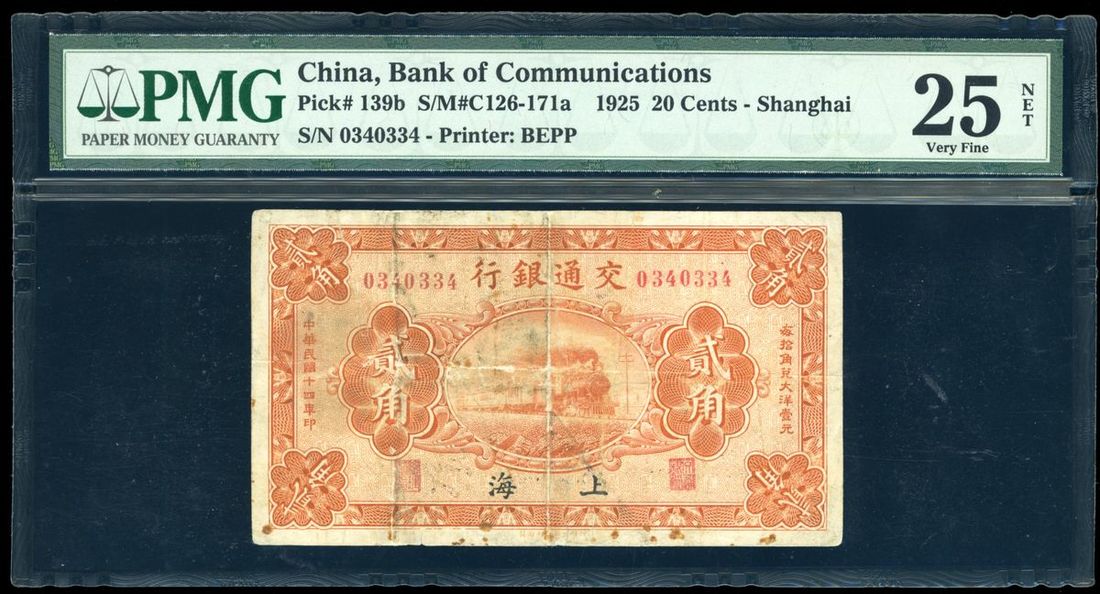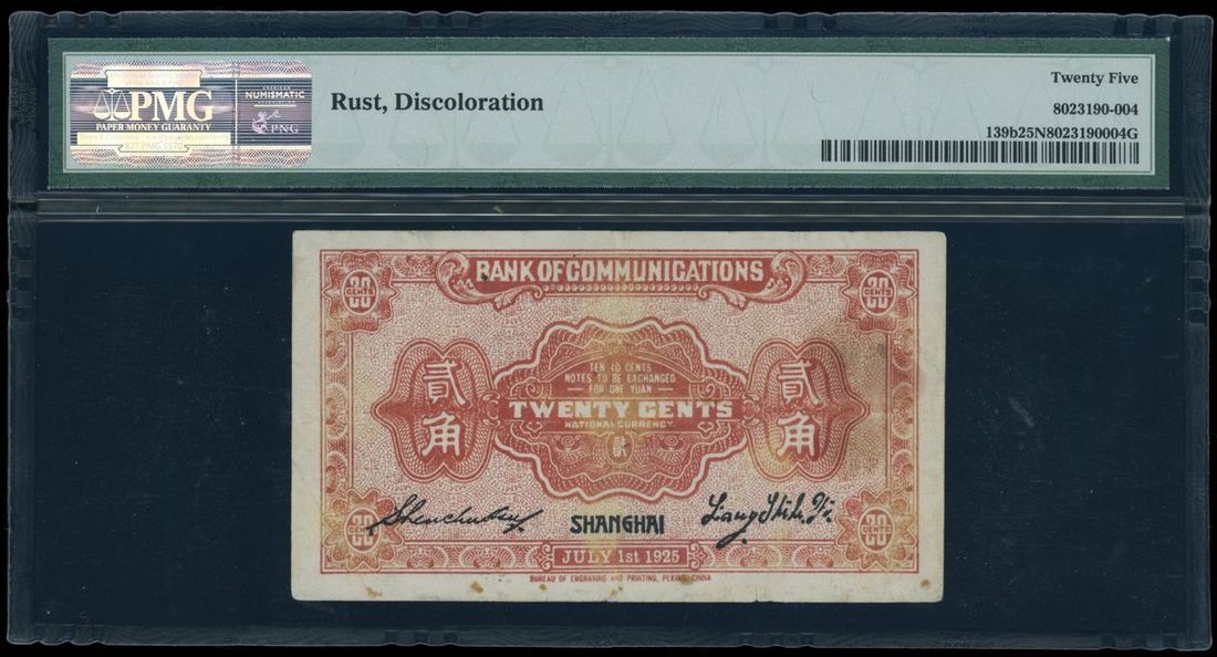 Bank of Communications, China, 20 cents, 1925, serial number 0340334, (Pick 139b), PMG 25NET, rust, discoloration