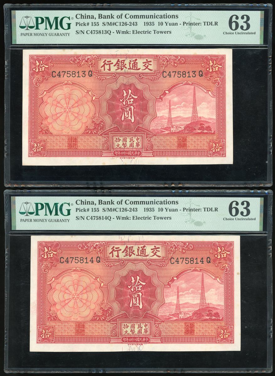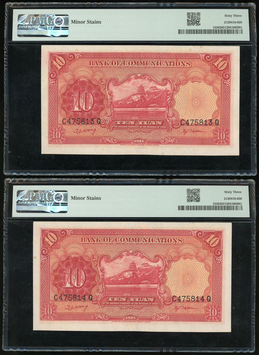 China, a group of 4x including, -Bank of Communications consecutive $10 (2) , Year 24 (1935), both PMG 63, minor stains,