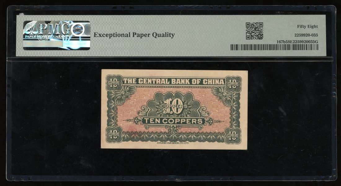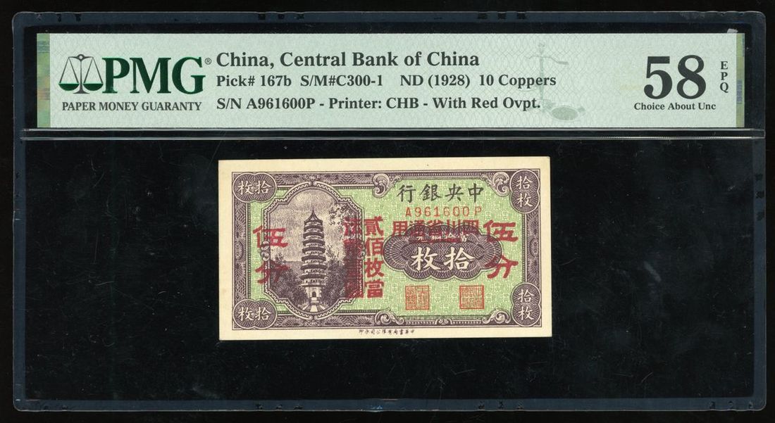 Central Bank of China, 5 cents, ND (1928), serial number A961600P, overprinted on 10 coppers for circulation in Szechuan Province,