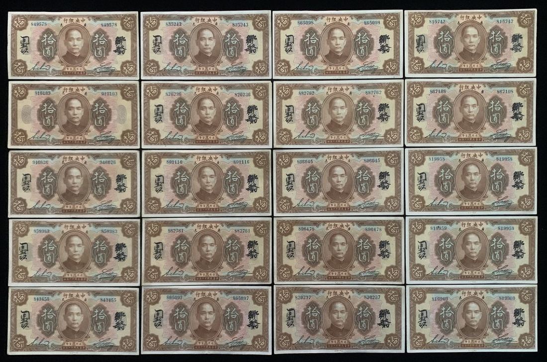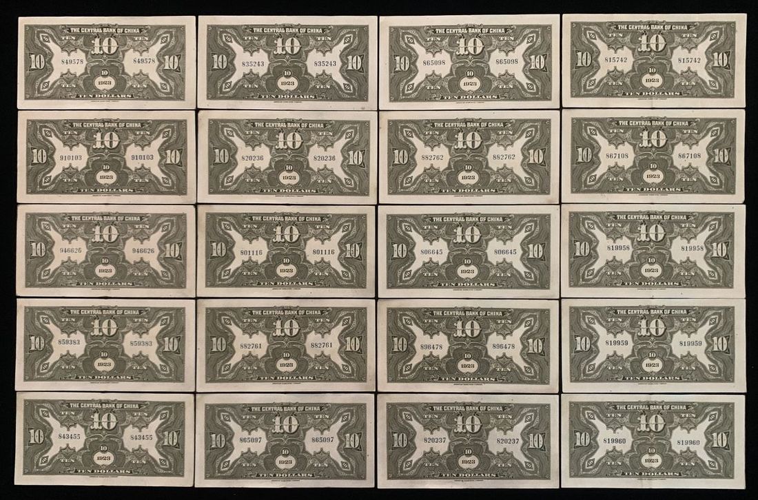 The Central Bank of China, a group of 20 x 10 yuan, Kwangtung, Year 12(1923), various serial numbers, Chinese and English signatures,
