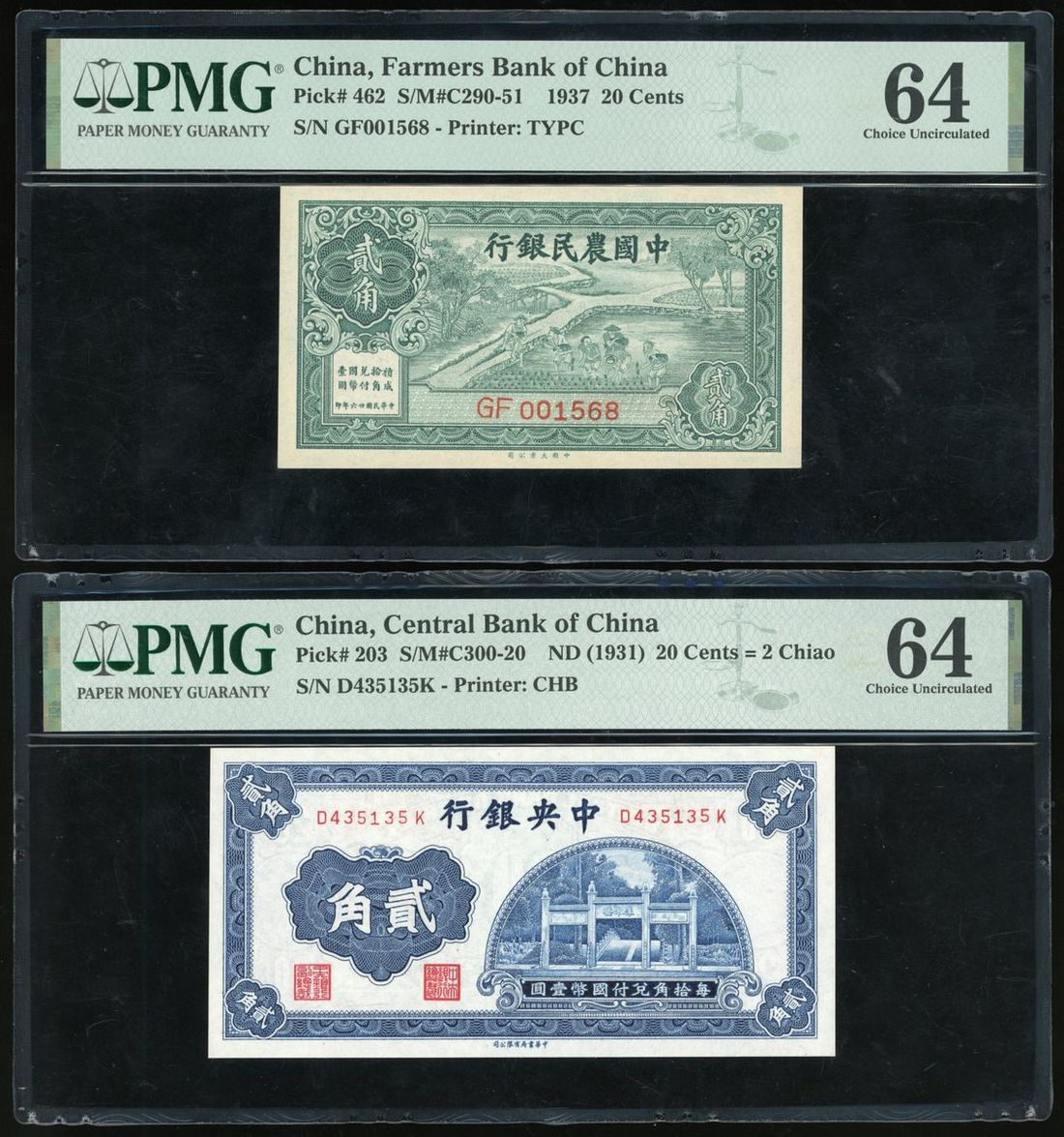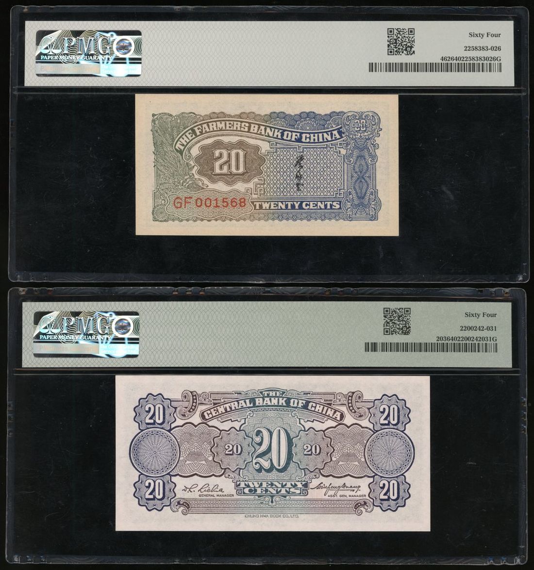 -Farmers Bank of China, 20 cents, Year 26, serial number GF001568,
