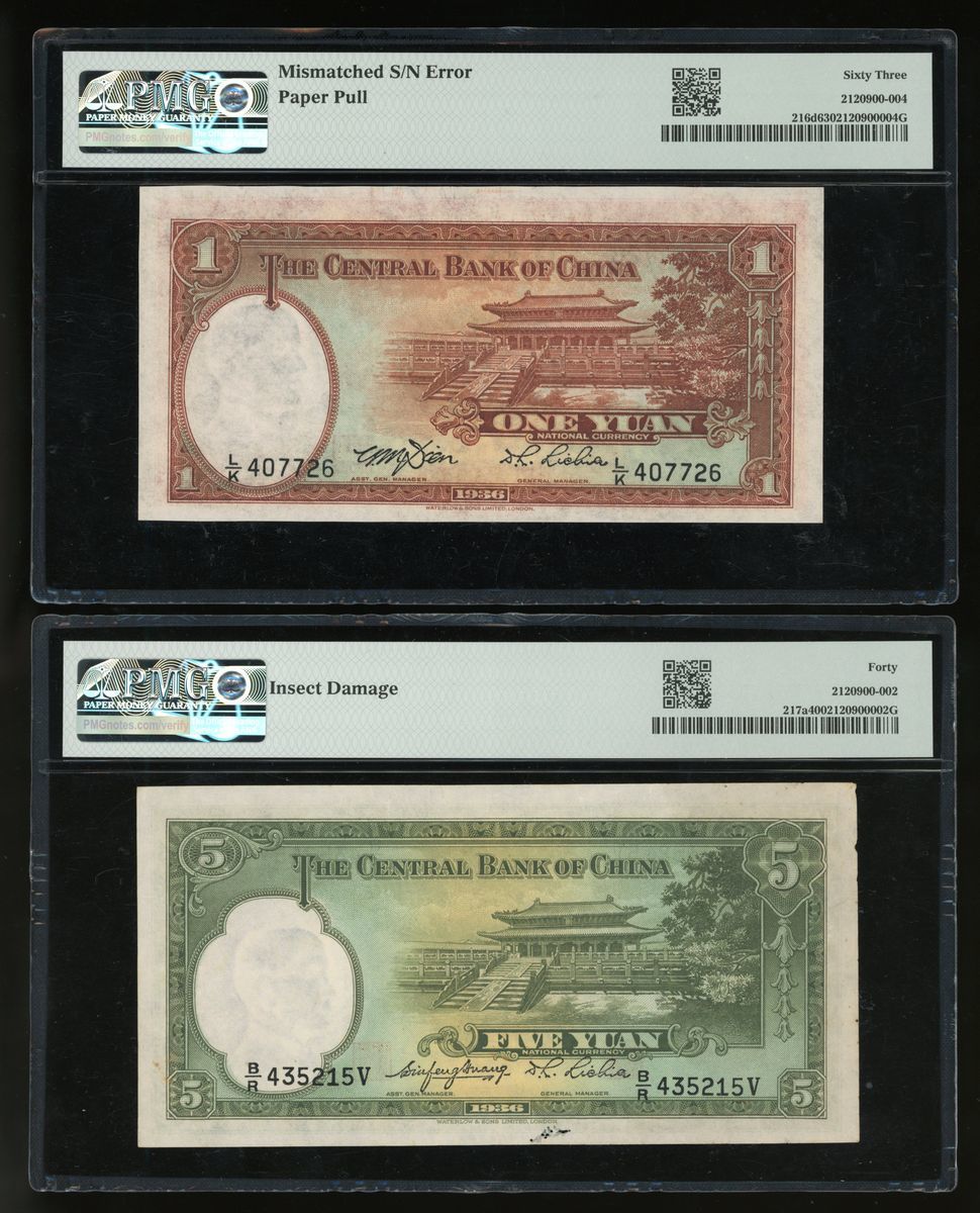 -Central Bank of China, remainder 5 yuan, 1936, Pick 217r, PMG 62NET,